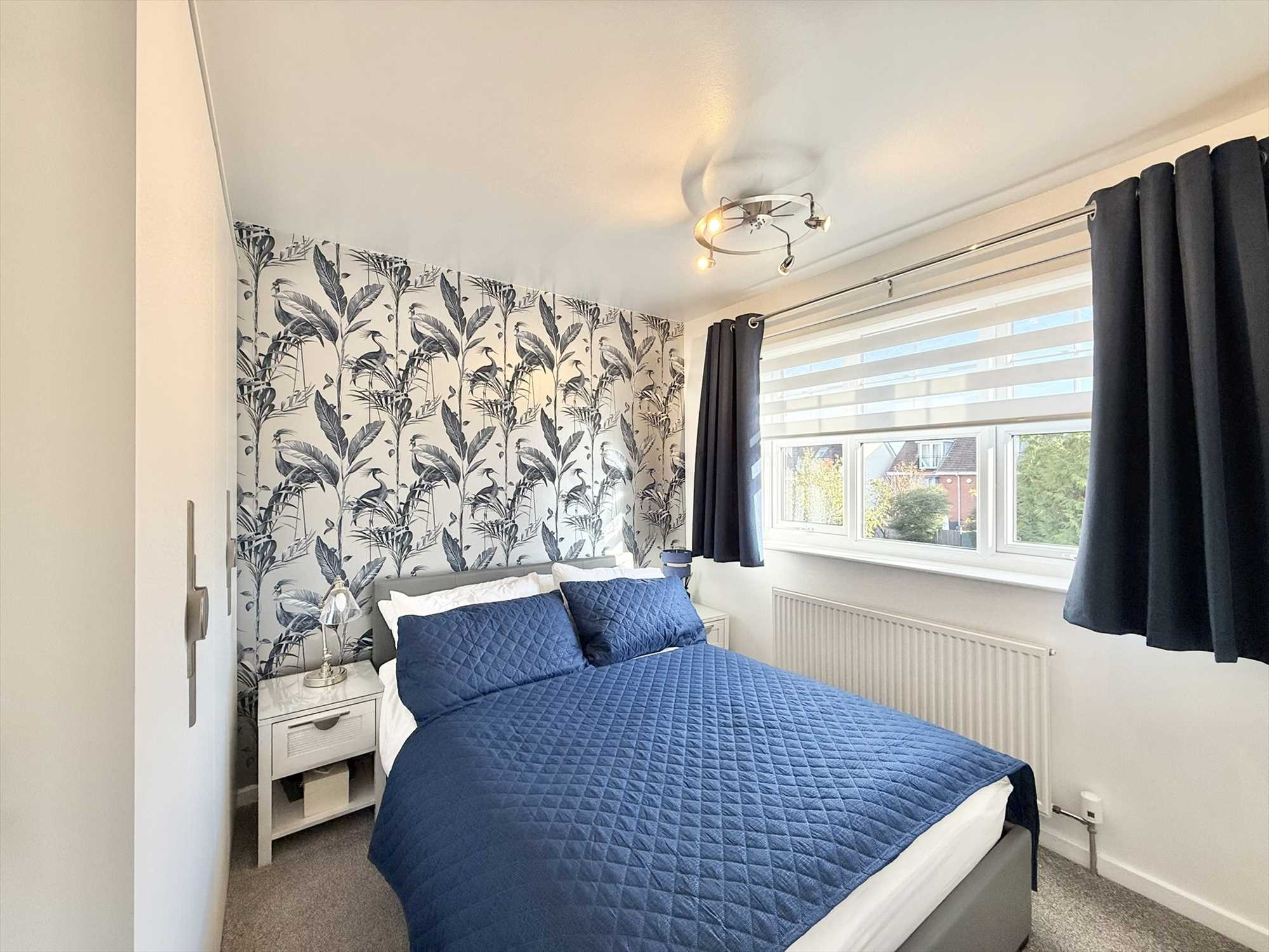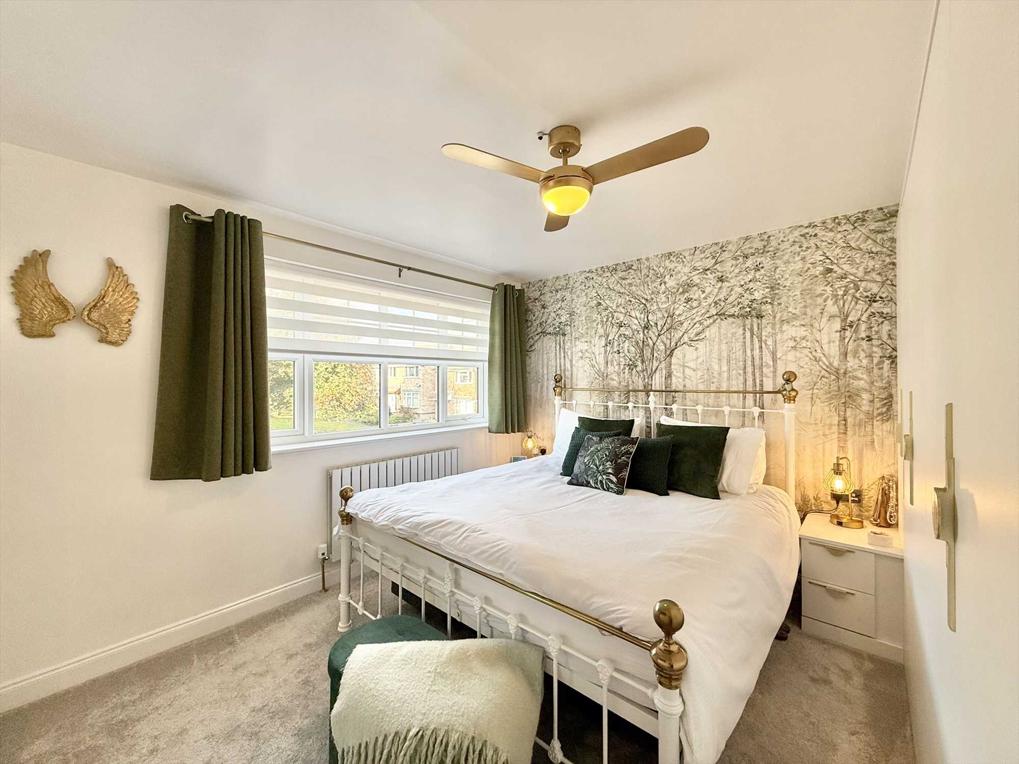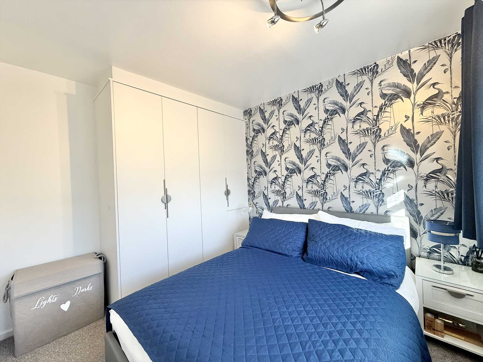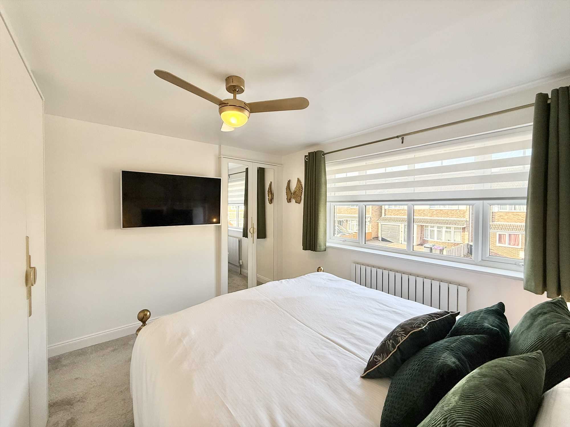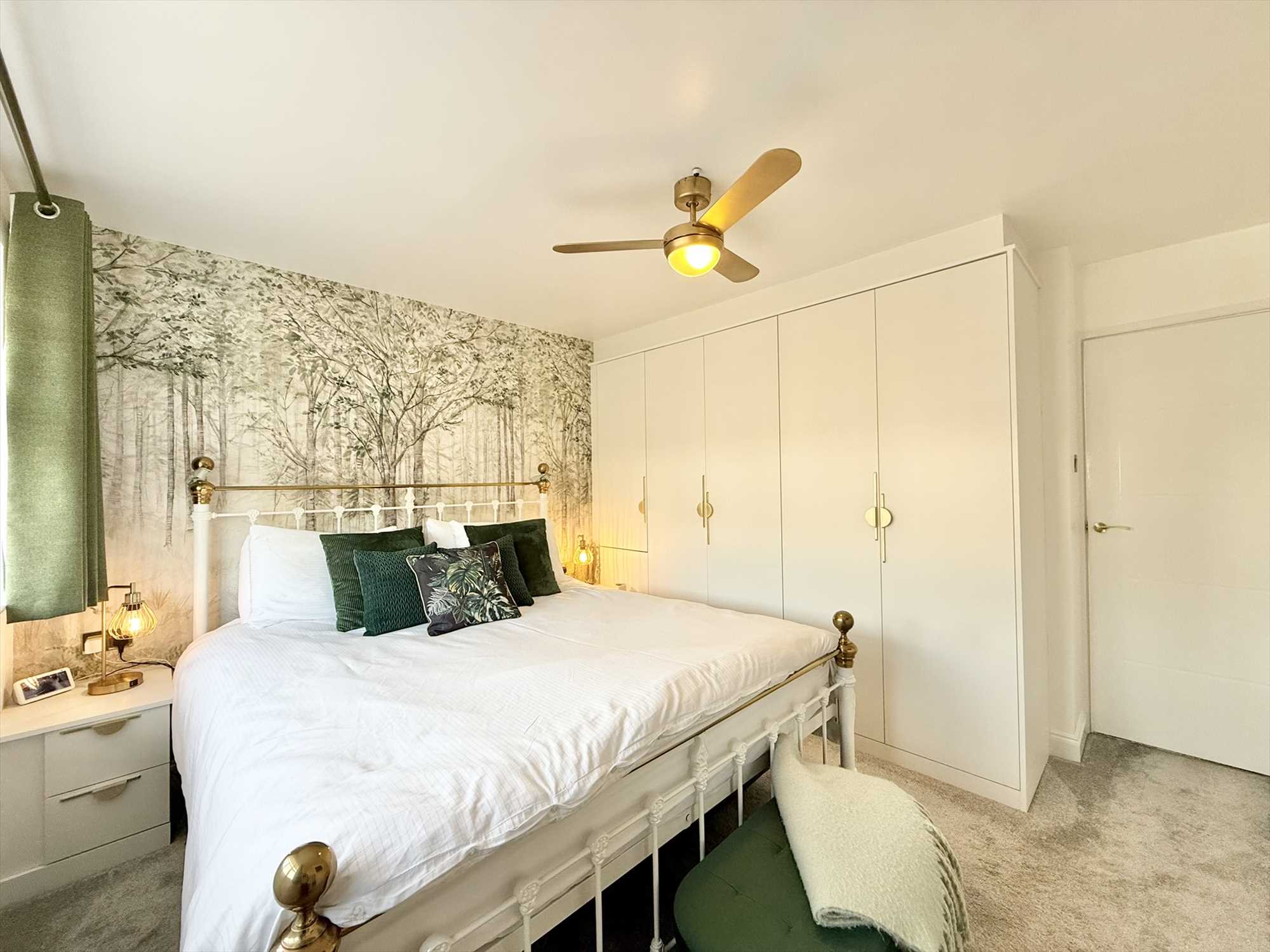 UPVC double glazed window to front aspect, ceiling light fan, bespoke fitted wardrobes and bedside tables, radiator, carpet.