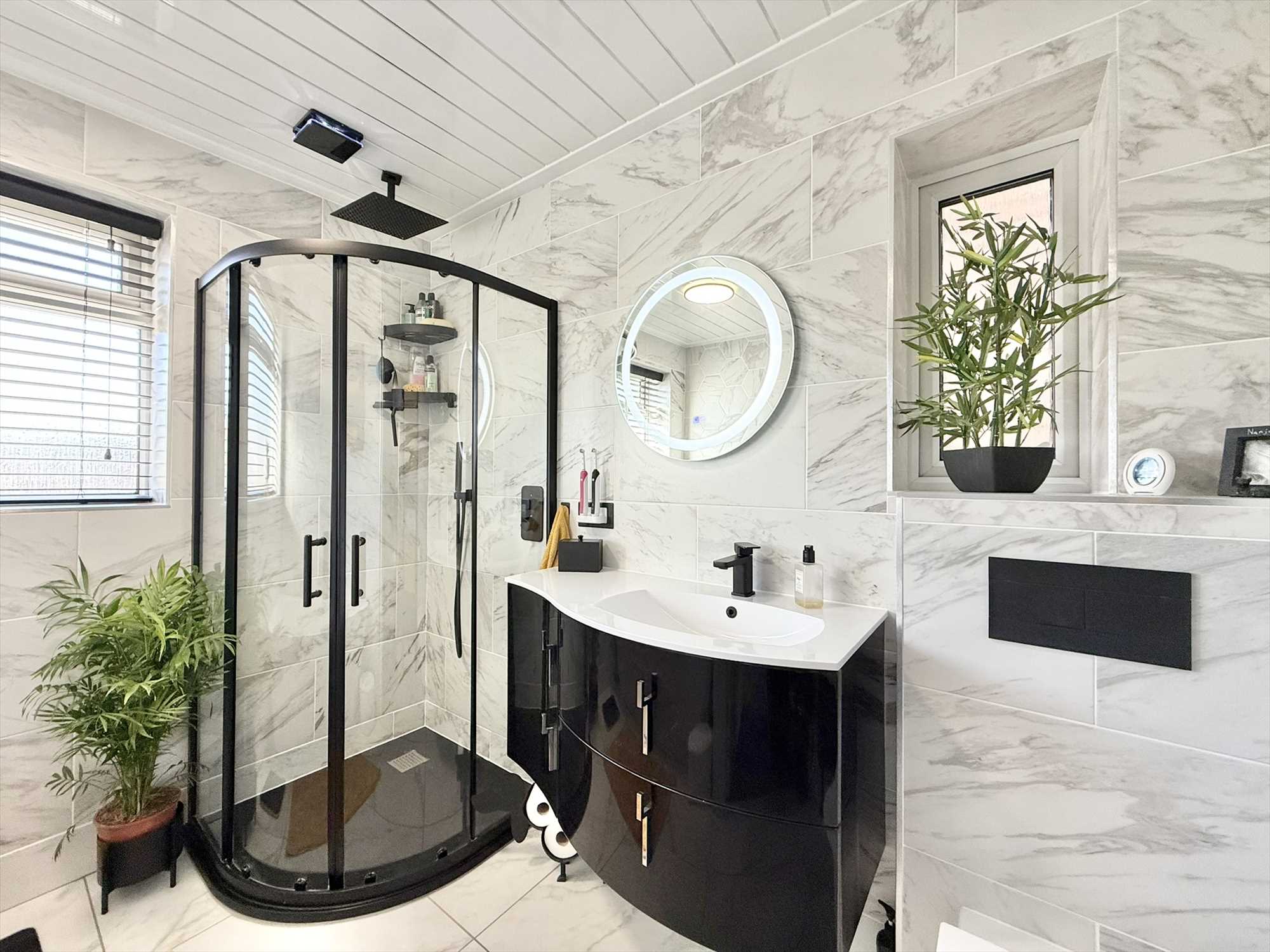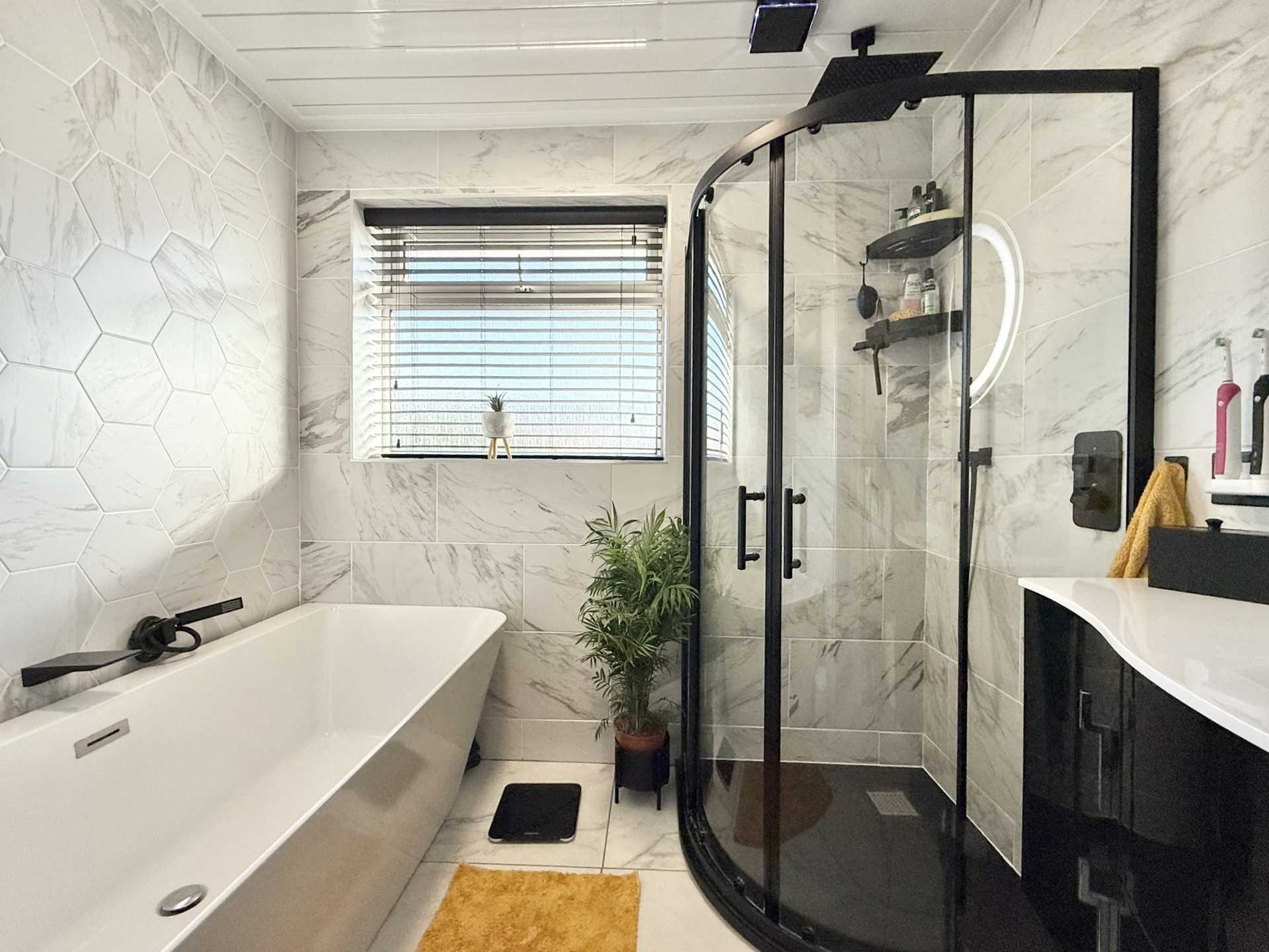 UPVC obscure double glazed window to rear and side aspect, ceiling light fitting, fully tiled walls, low level flush WC, vanity hand wash basin, enclosed corner shower unit, free standing bath, heated towel rail, tiled flooring.
