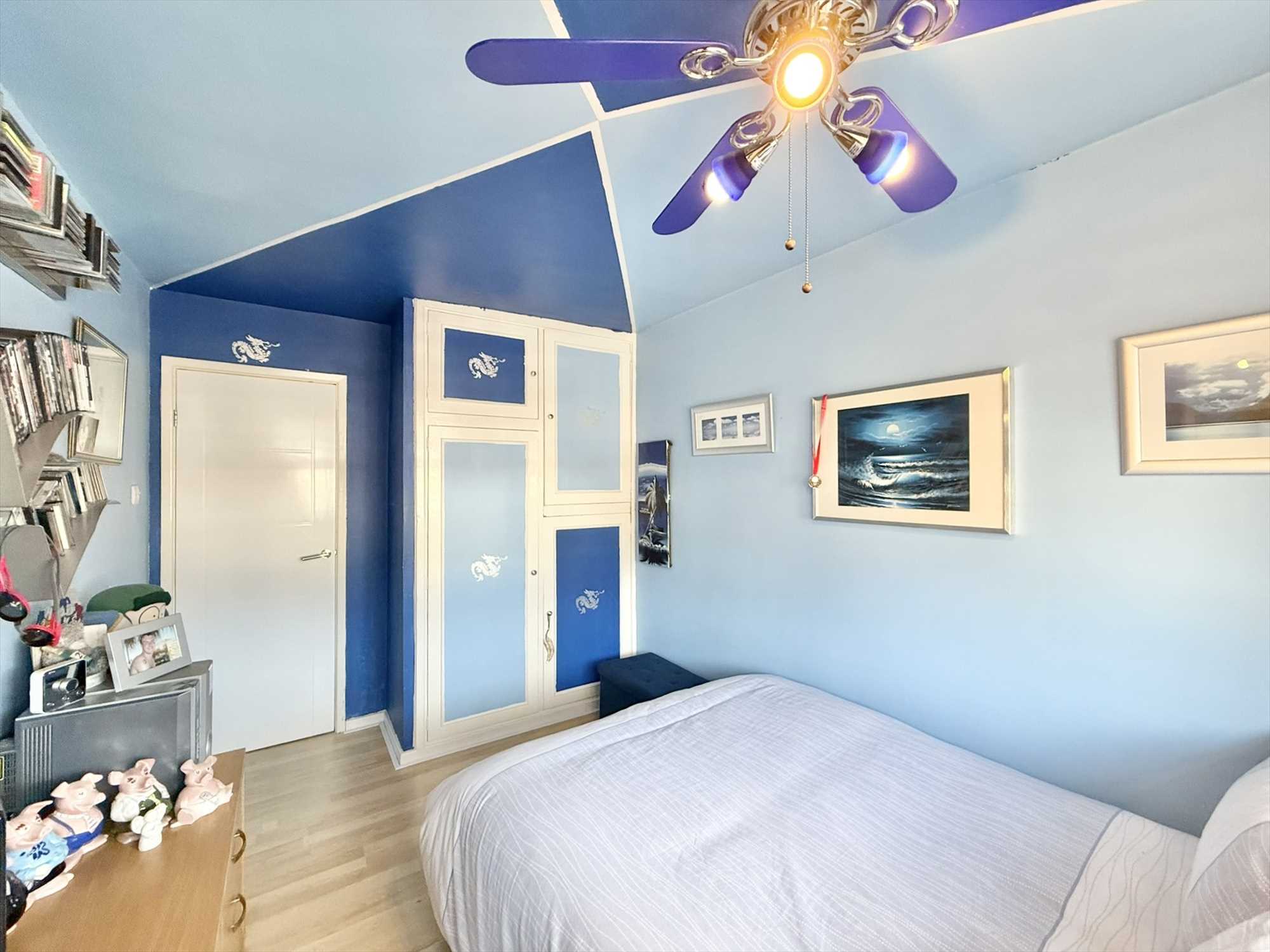 UPVC double glazed window to front aspect, ceiling light fan, built in wardrobes, radiator, wood effect flooring.