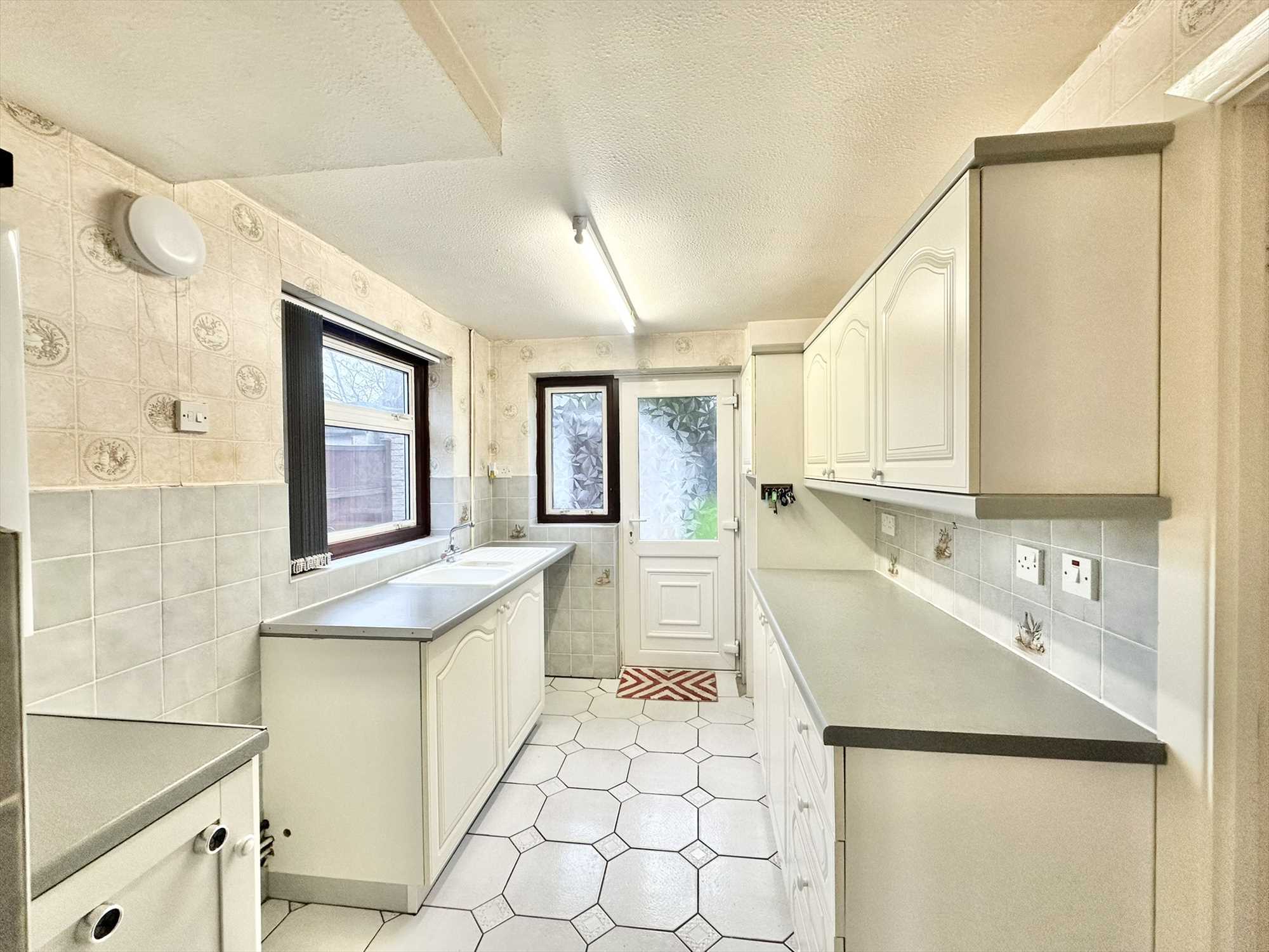 UPVC obscure door to the rear aspect, UPVC window to the side aspect, ceiling light fitting, matching wall drawer and base units, partially tiled walls, tile effect floor.