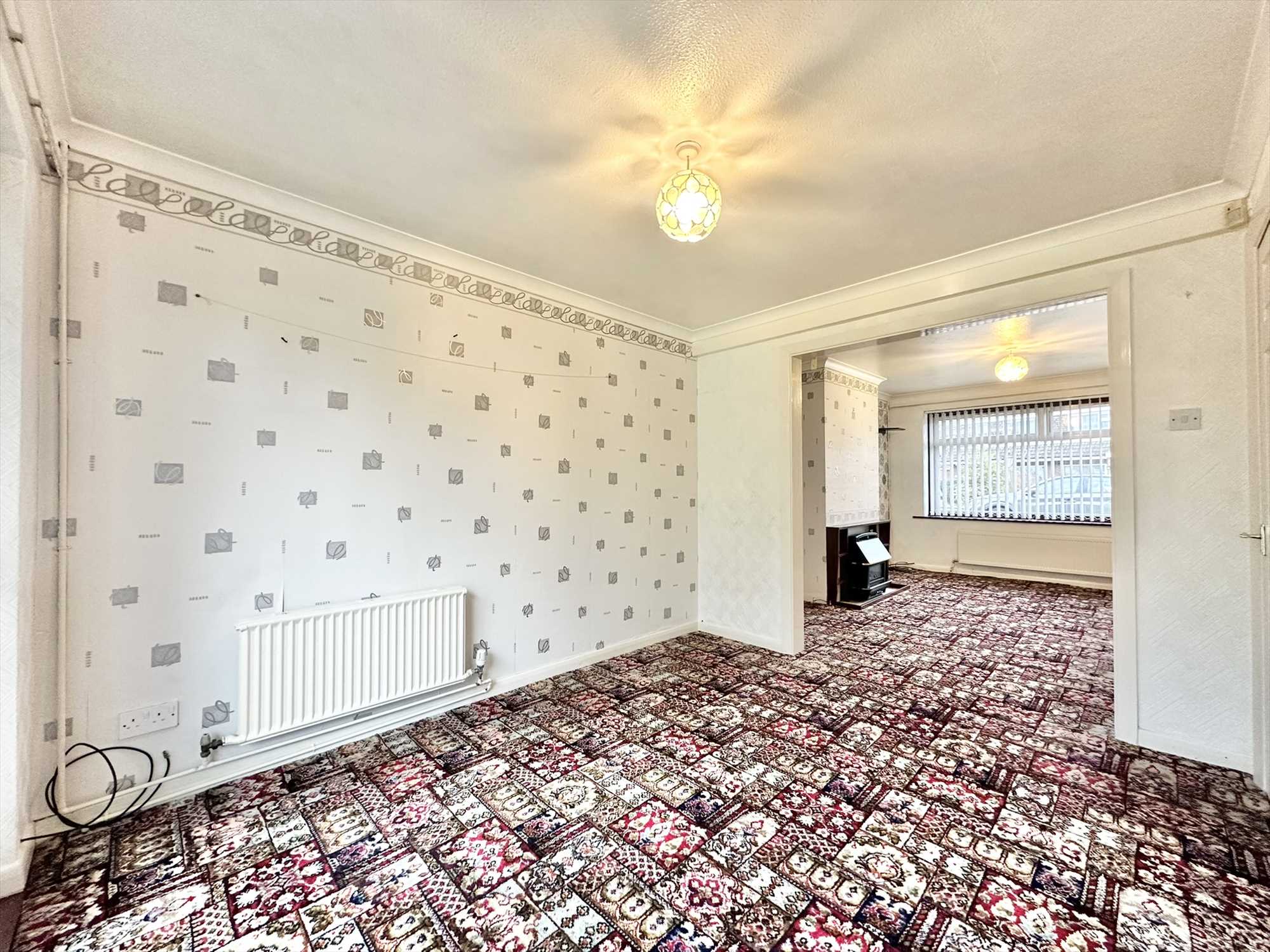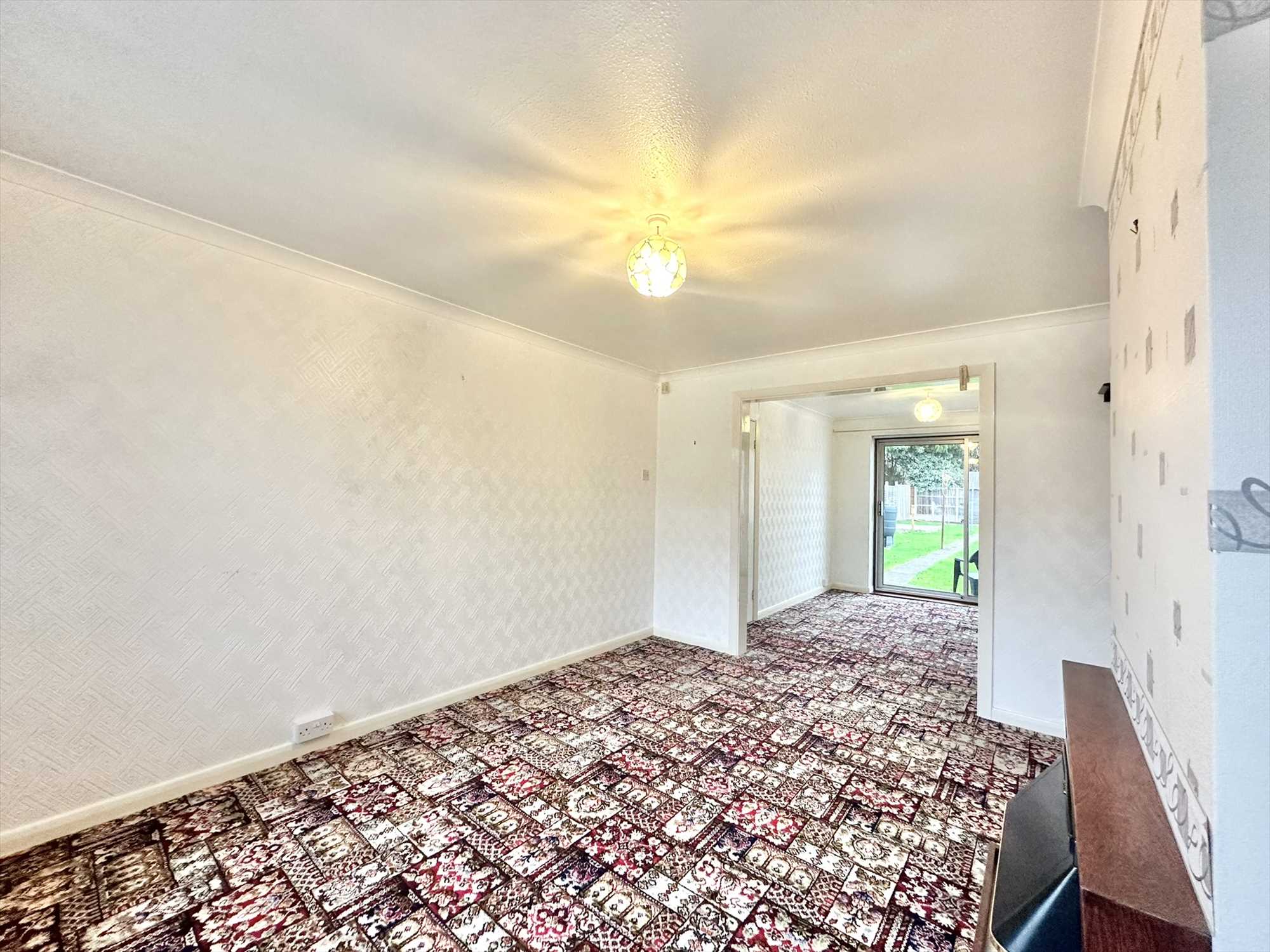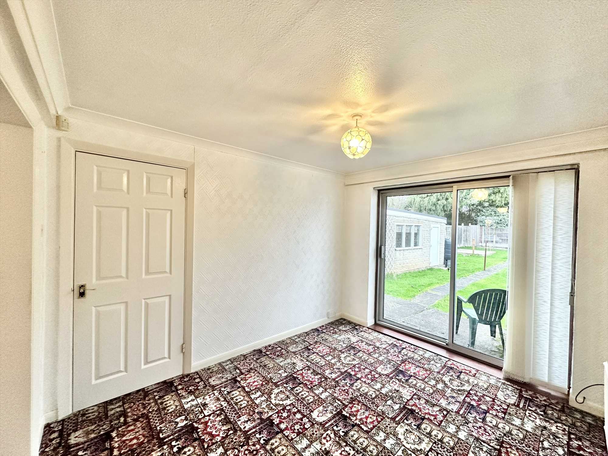 UPVC sliding patio doors to the rear aspect, ceiling light pendant, radiator, carpet underfoot.