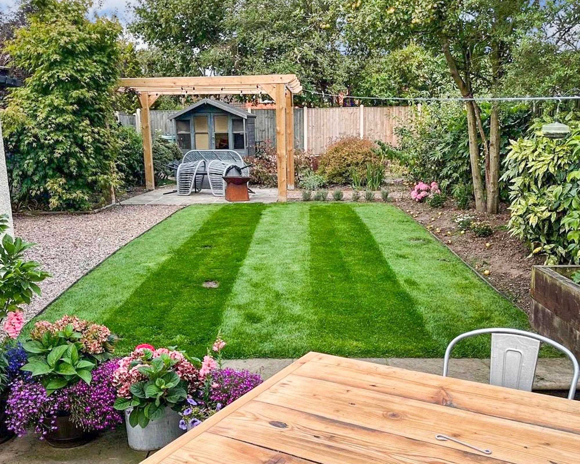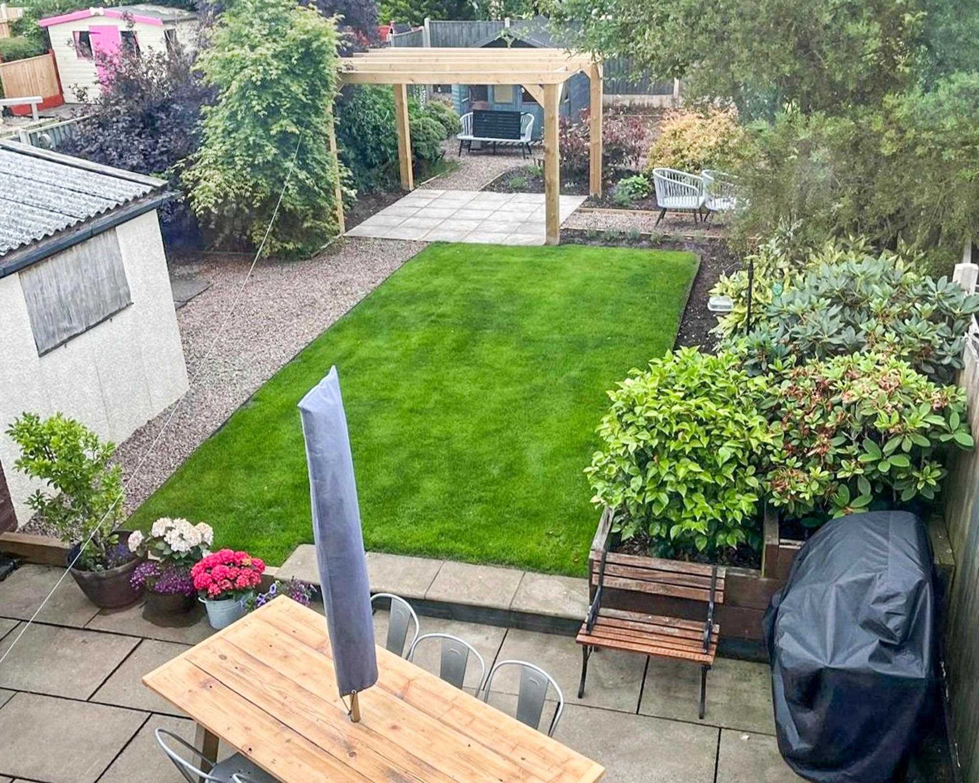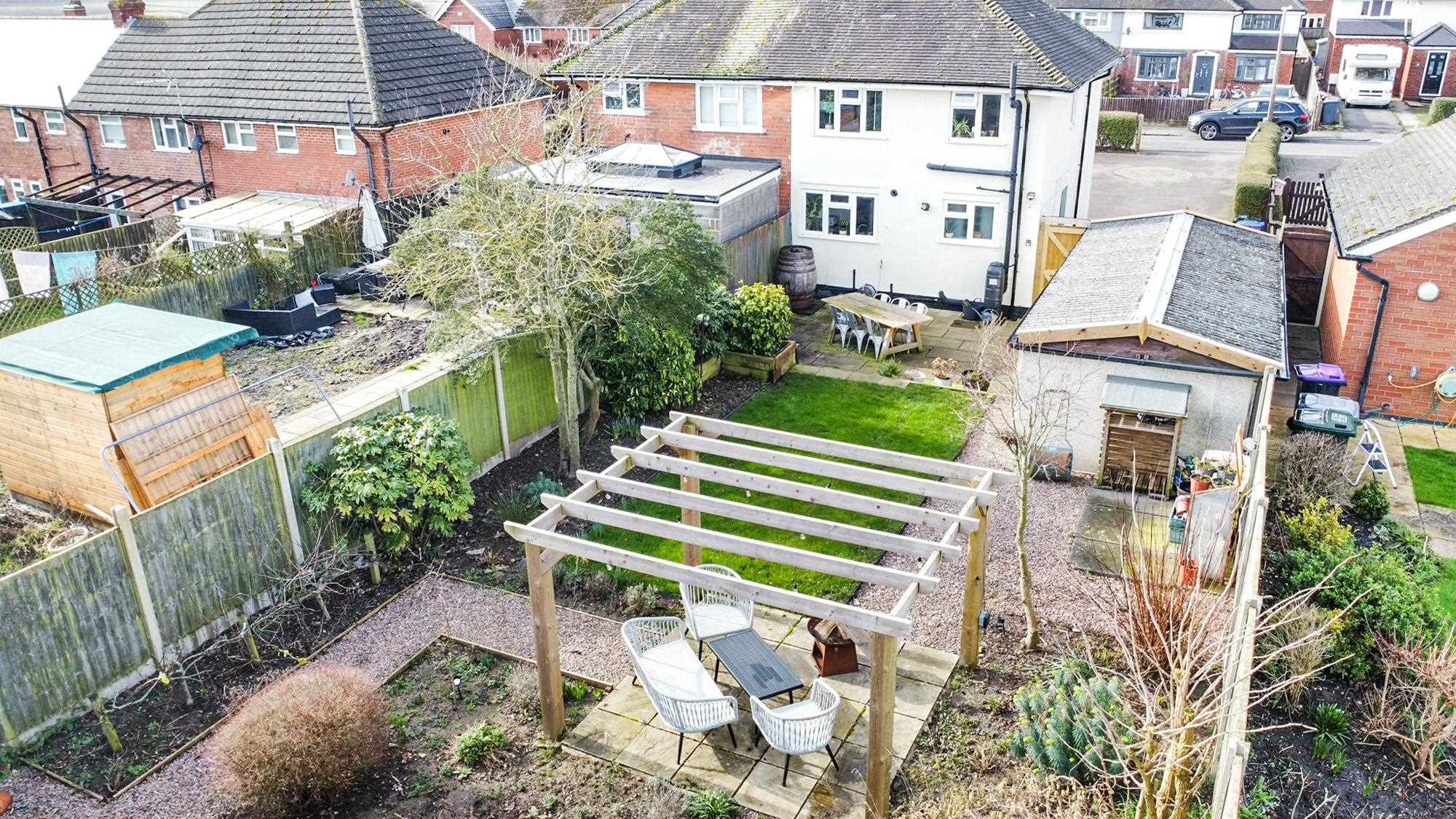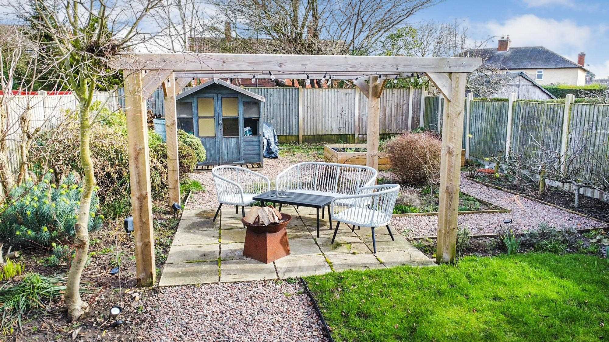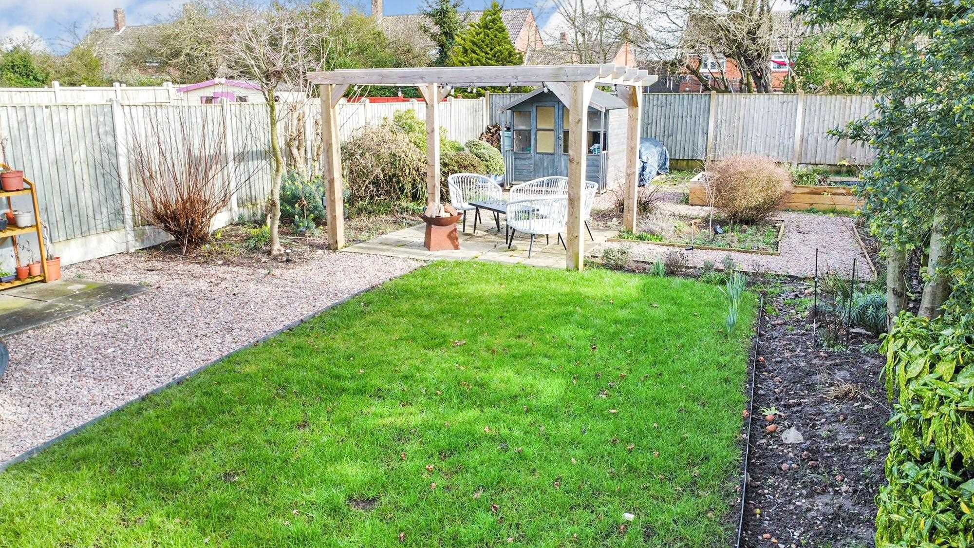 Well presented rear garden with lawn and pergola seating area and separate patio area. The garden has established shrubs and trees and shed to the bottom. Gated access to the front drive.