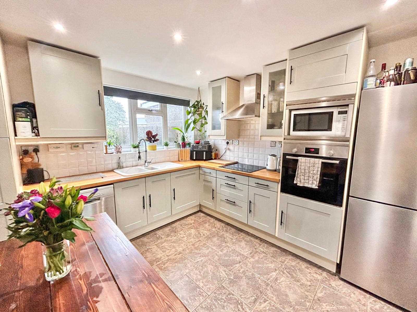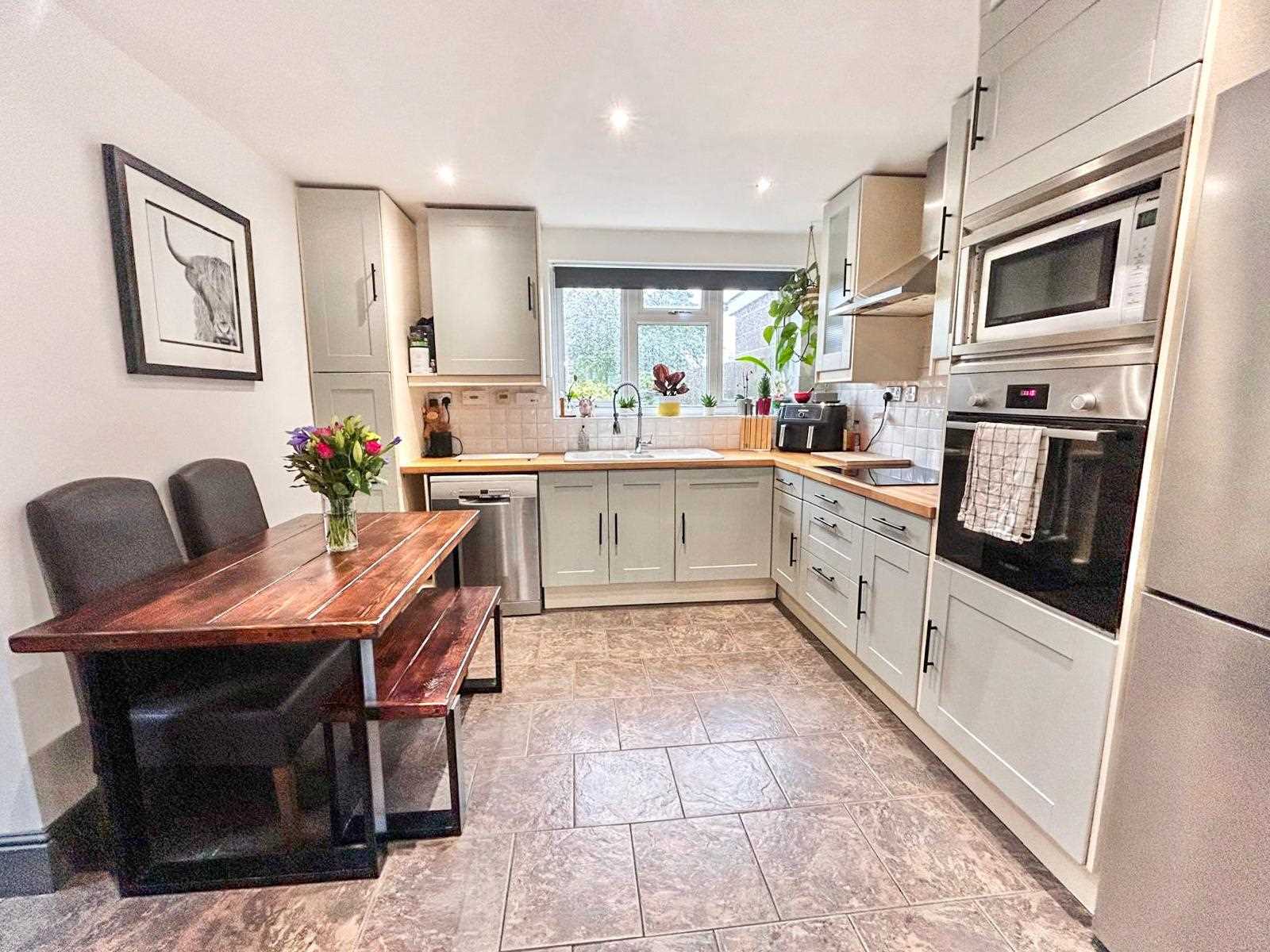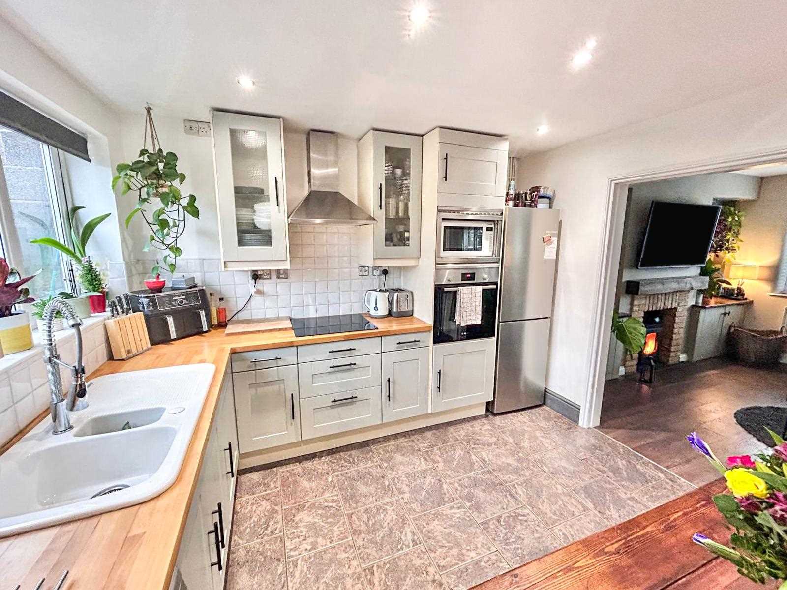Kitchen diner with fitted wall and base units. Integrated oven and electric hob with extractor over, space for fridge freezer, space for dishwasher, ceramic sink with drainer and mixer hose tap. The flooring is fully tiled, black radiator, ceiling spotlights and window to the rear aspect. Door onto the side aspect.