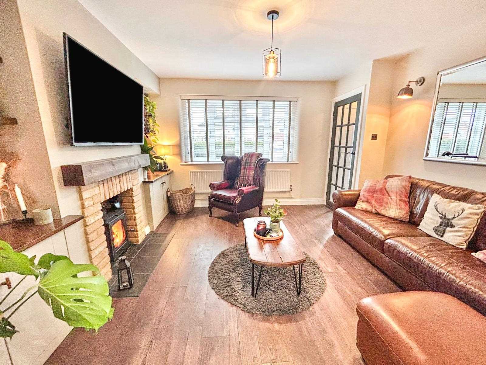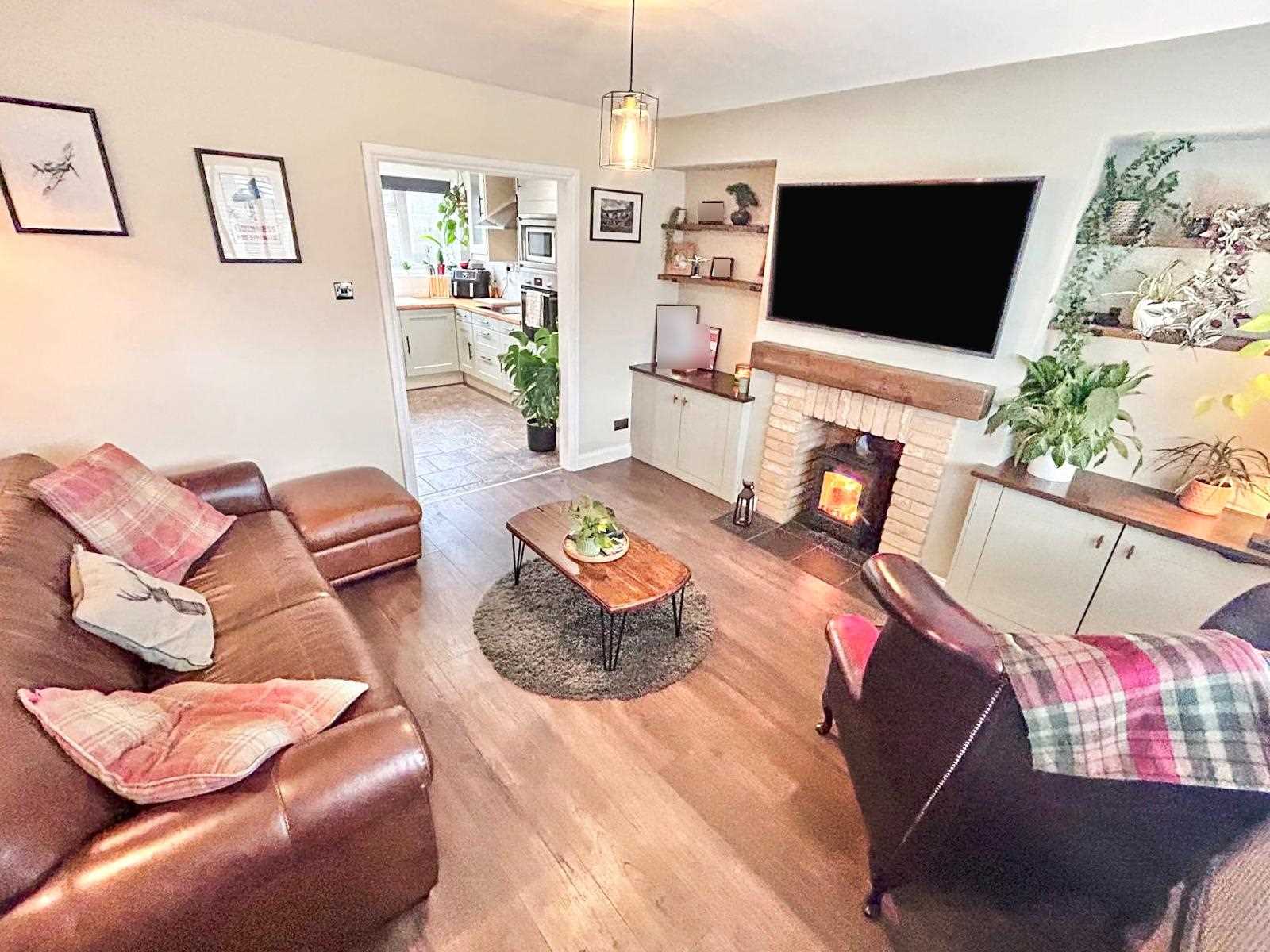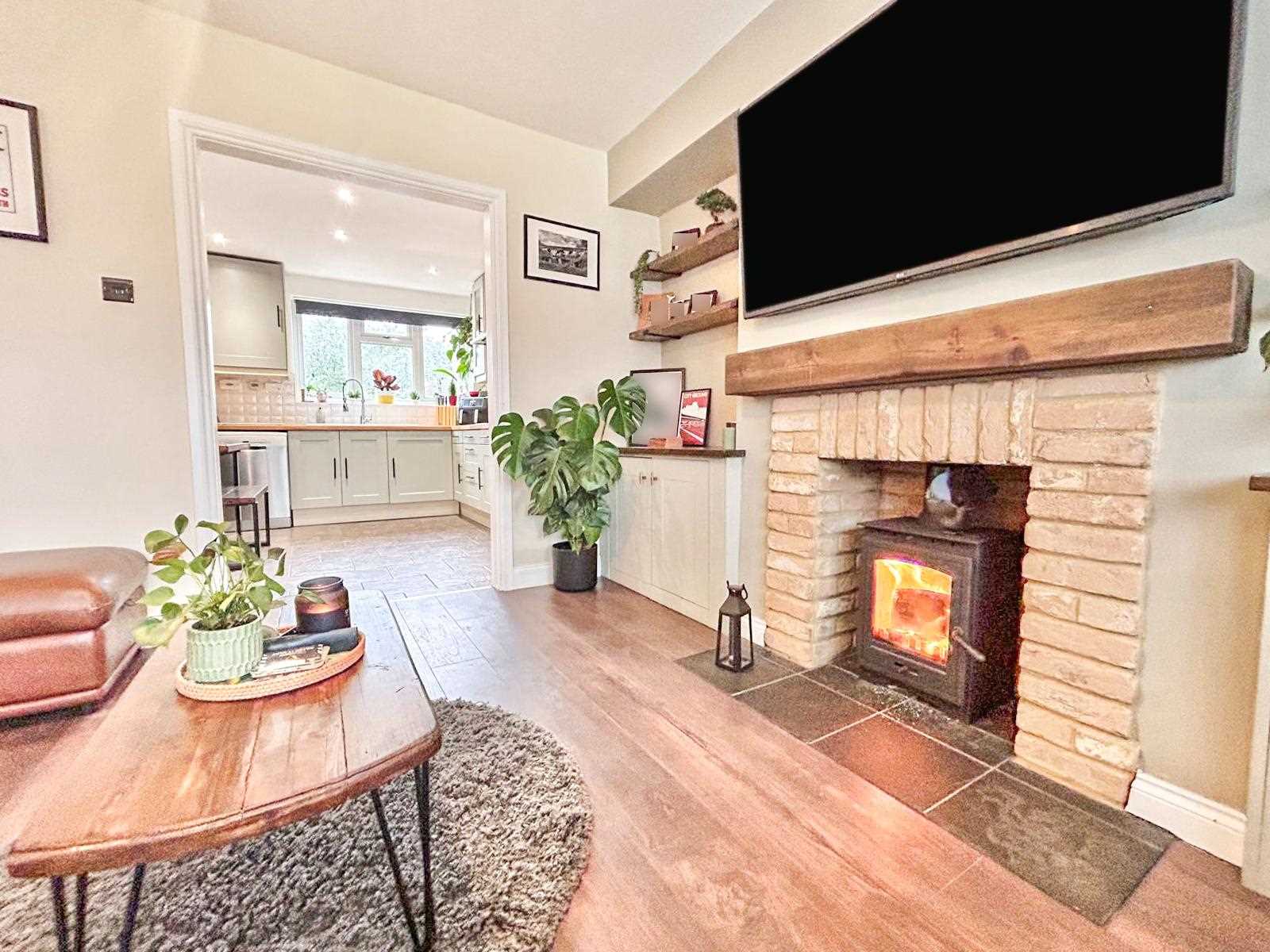 Well presented living room with window to the front aspect, feature log burner with built in cupboards and shelves either side, wood flooring, radiator and ceiling pendant light and wall lights.