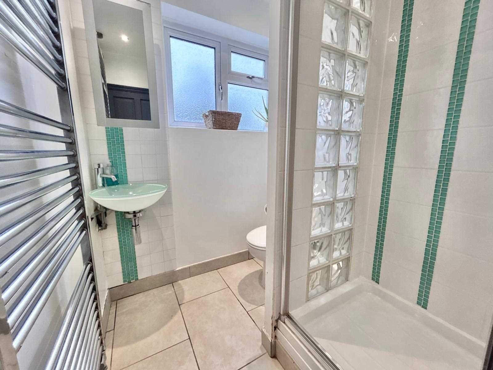 Shower cubicle with wc and hand wash basin, towel rail radiator & window to the rear aspect.