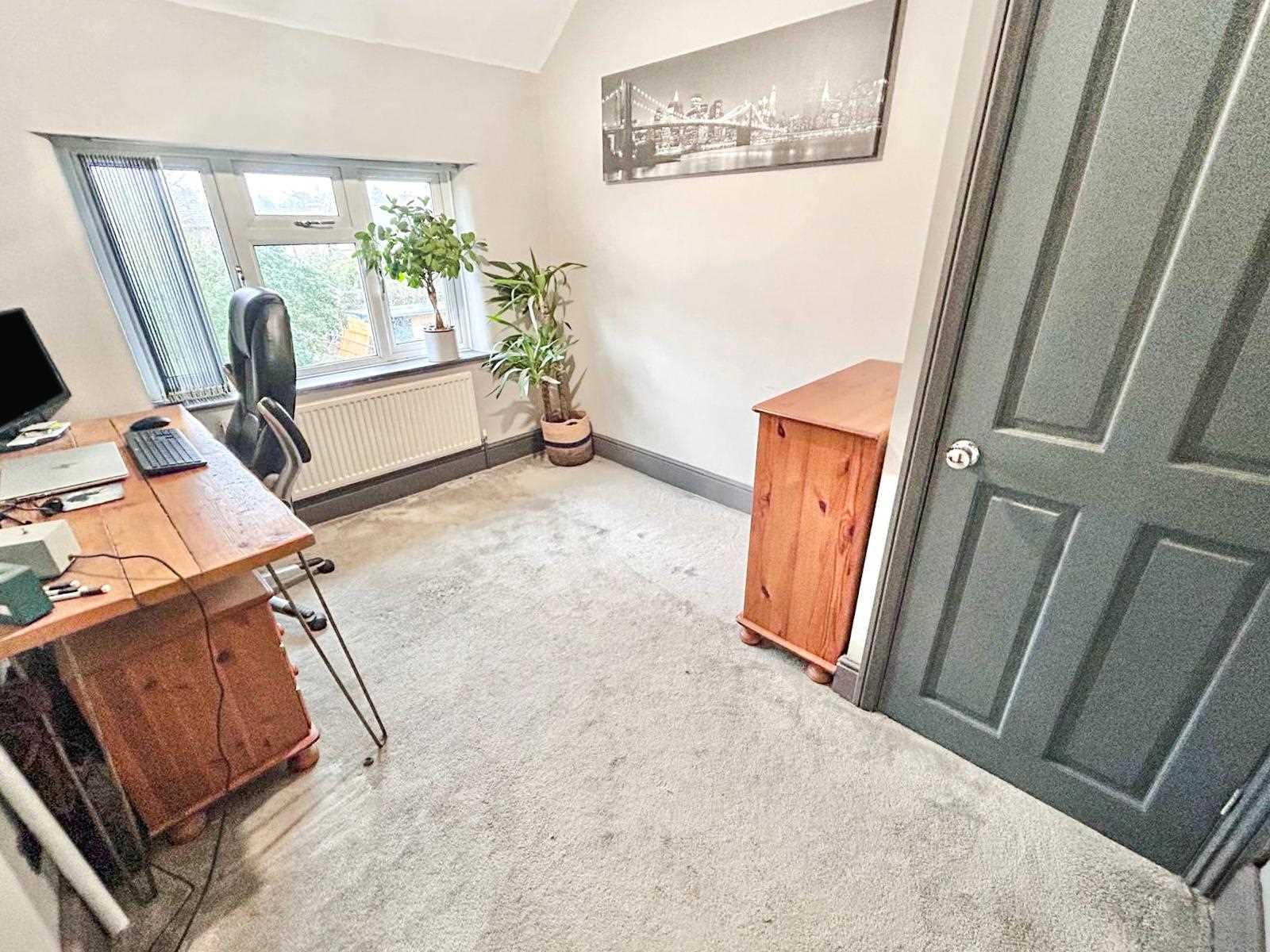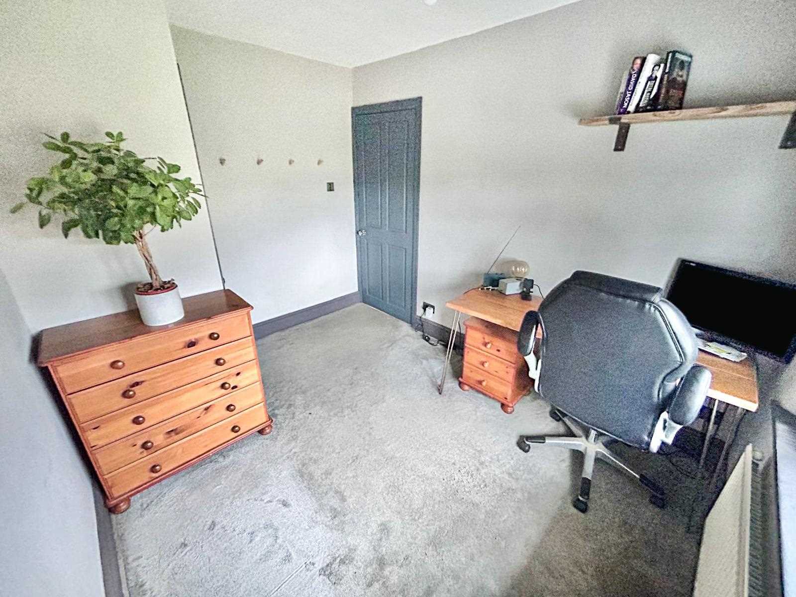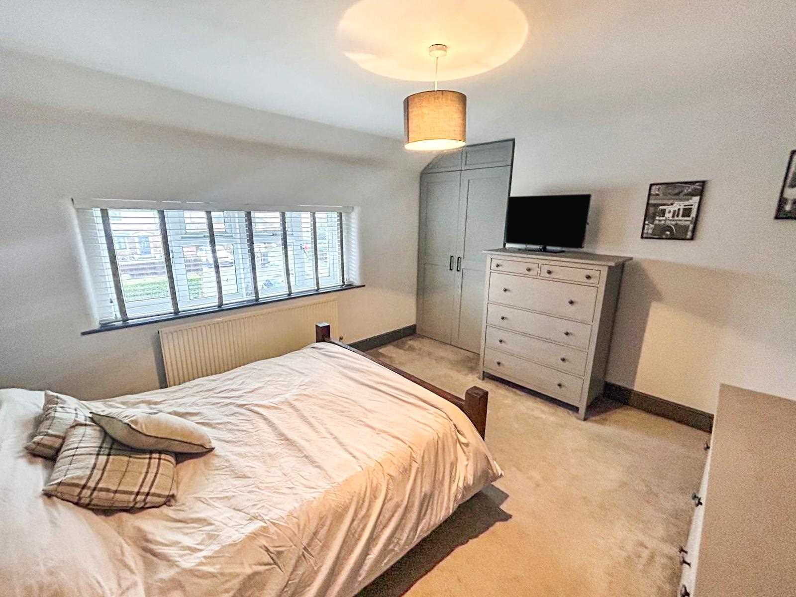 Window to the rear aspect with fitted blinds, storage cupboard, ceiling light fitting, carpet to floor & radiator.