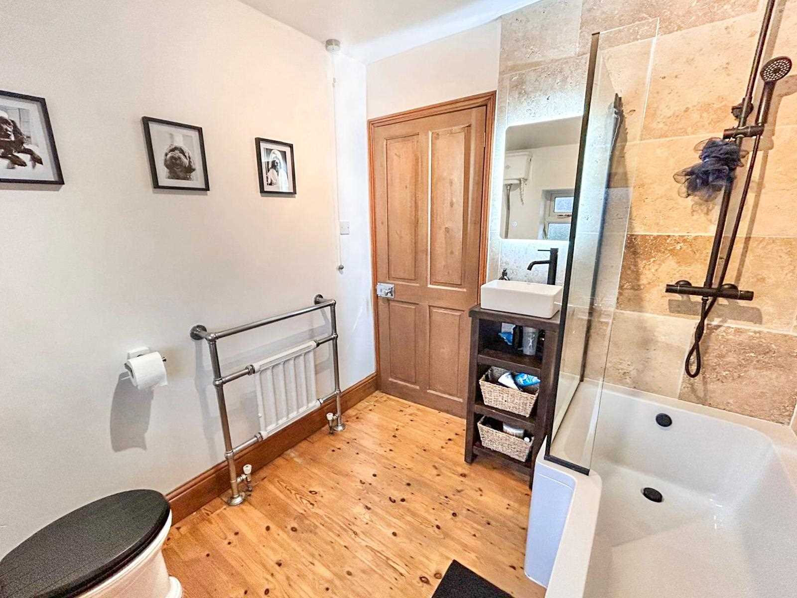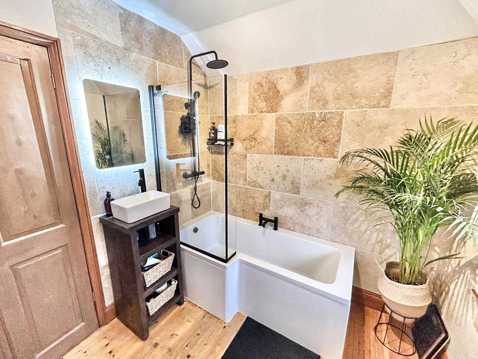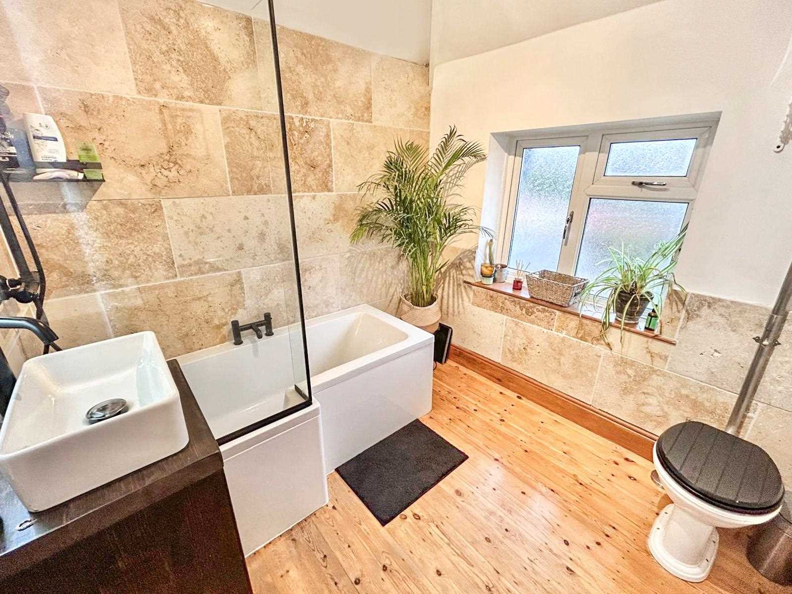 Recently renovated bathroom with stone tiles around the shower and bath. Black bath taps and shower head. Hand wash basin with built-in storage shelves. WC and towel radiator. Frosted window to the rear aspect.