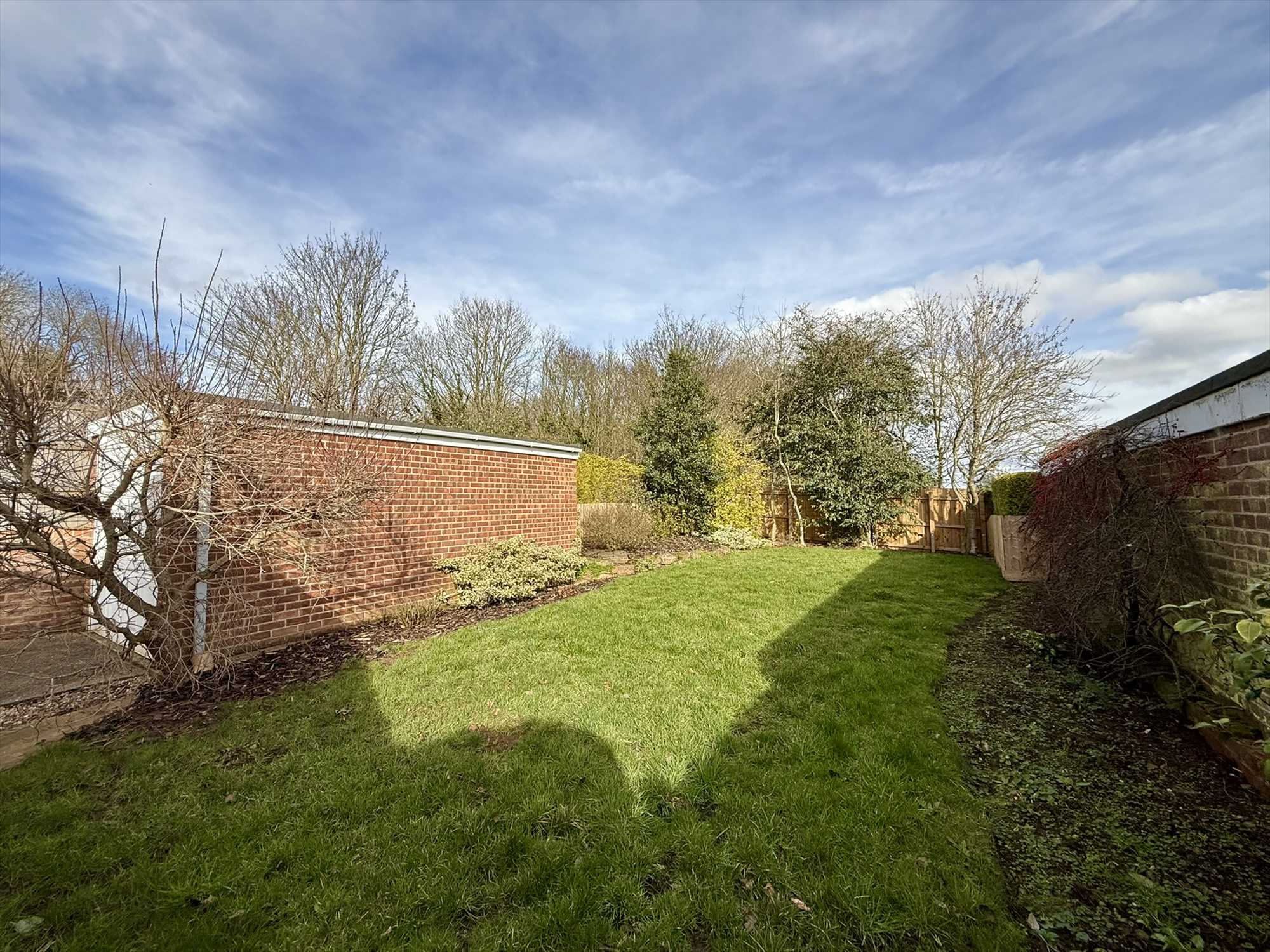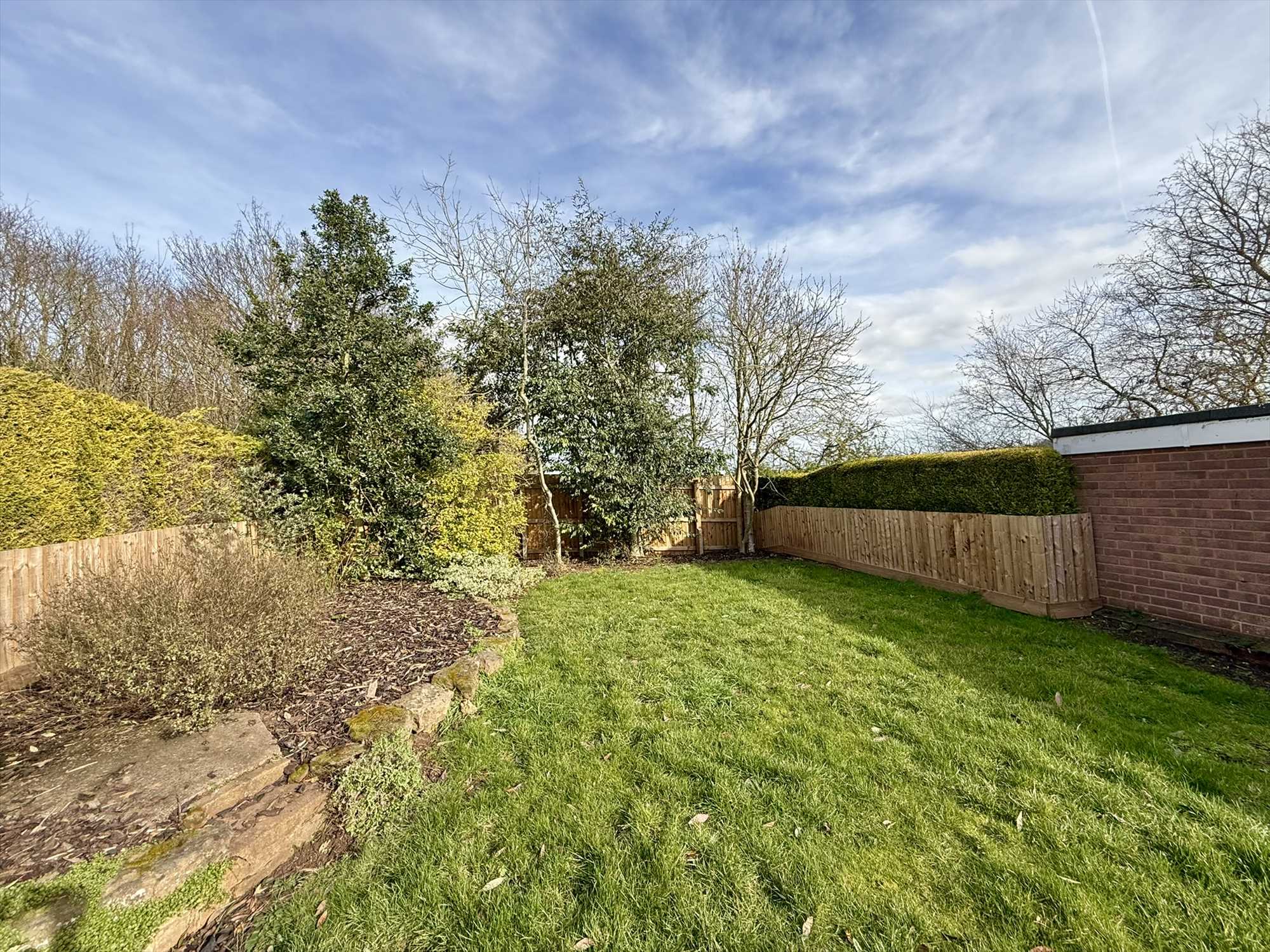 To the rear of the property lies a beautifully maintained garden, predominantly laid to lawn and complemented by a variety of established perennial shrubs, mature trees, and attractive timber fencing. A thoughtfully positioned patio area offers an ideal space for outdoor dining and entertaining.