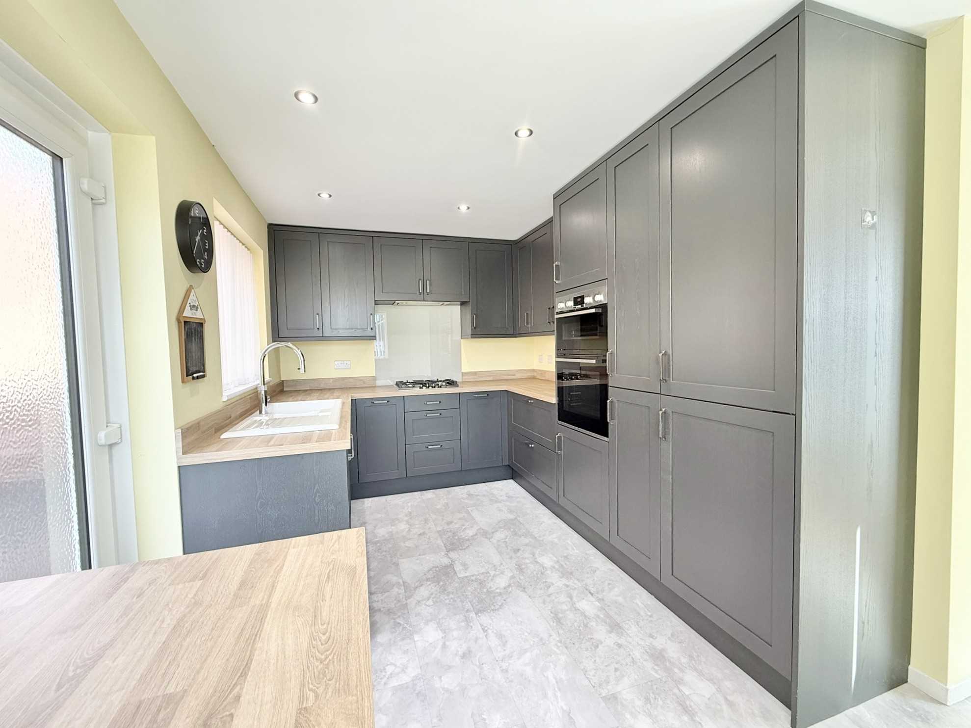 UPVC obscure double glazed exterior door to side aspect, UPVC double glazed windows to the side and front aspect, ceiling spotlights, a range of wall, drawer, and base units with wood effect worktop over, inset ceramic sink and drainer unit with mixer tap over, four ring gas hob with glass splashback and extractor hood over, integrated double oven, washing machine, integrated fridge freezer, integrated slimline dishwasher, radiator, tile effect flooring.