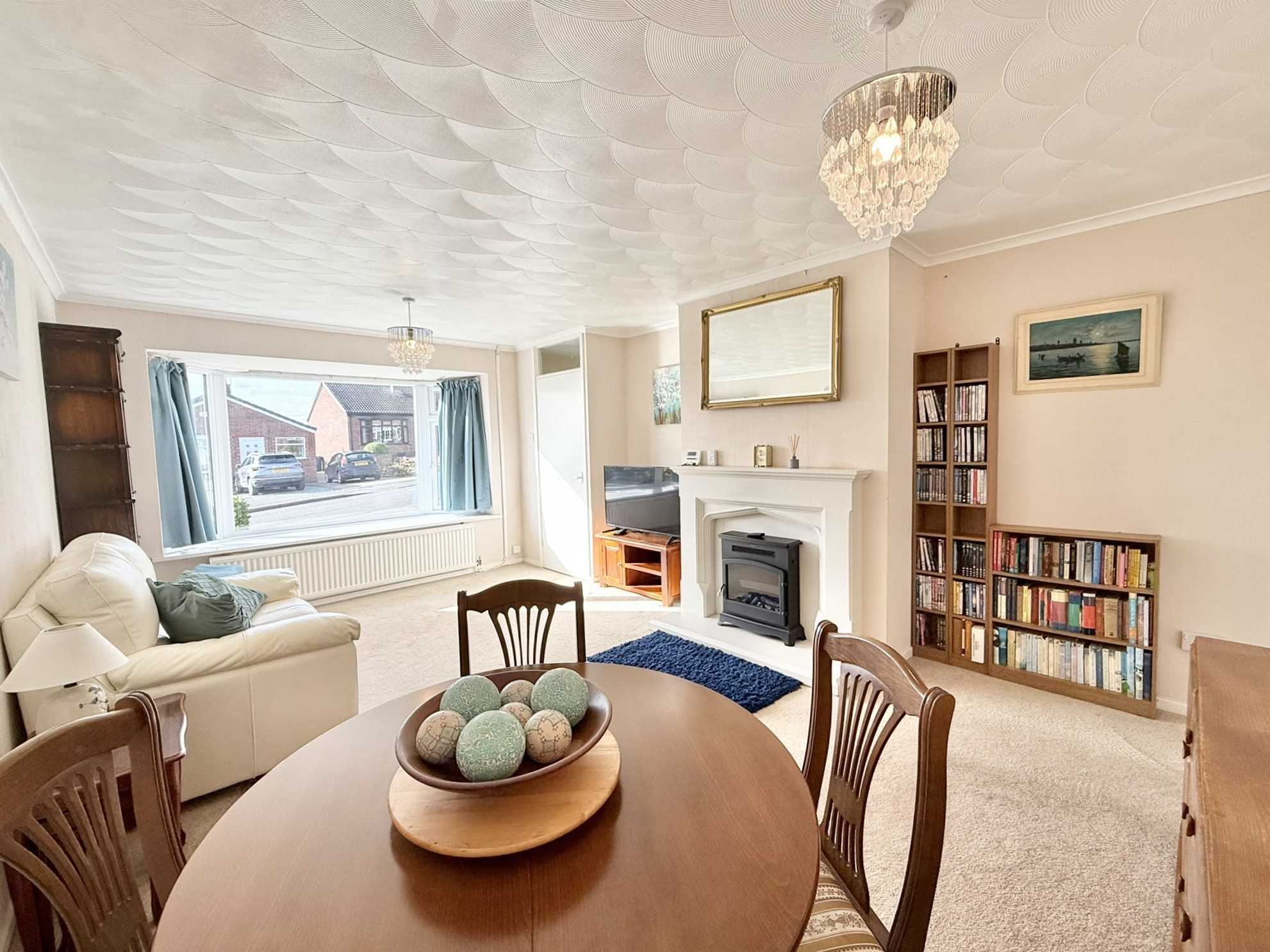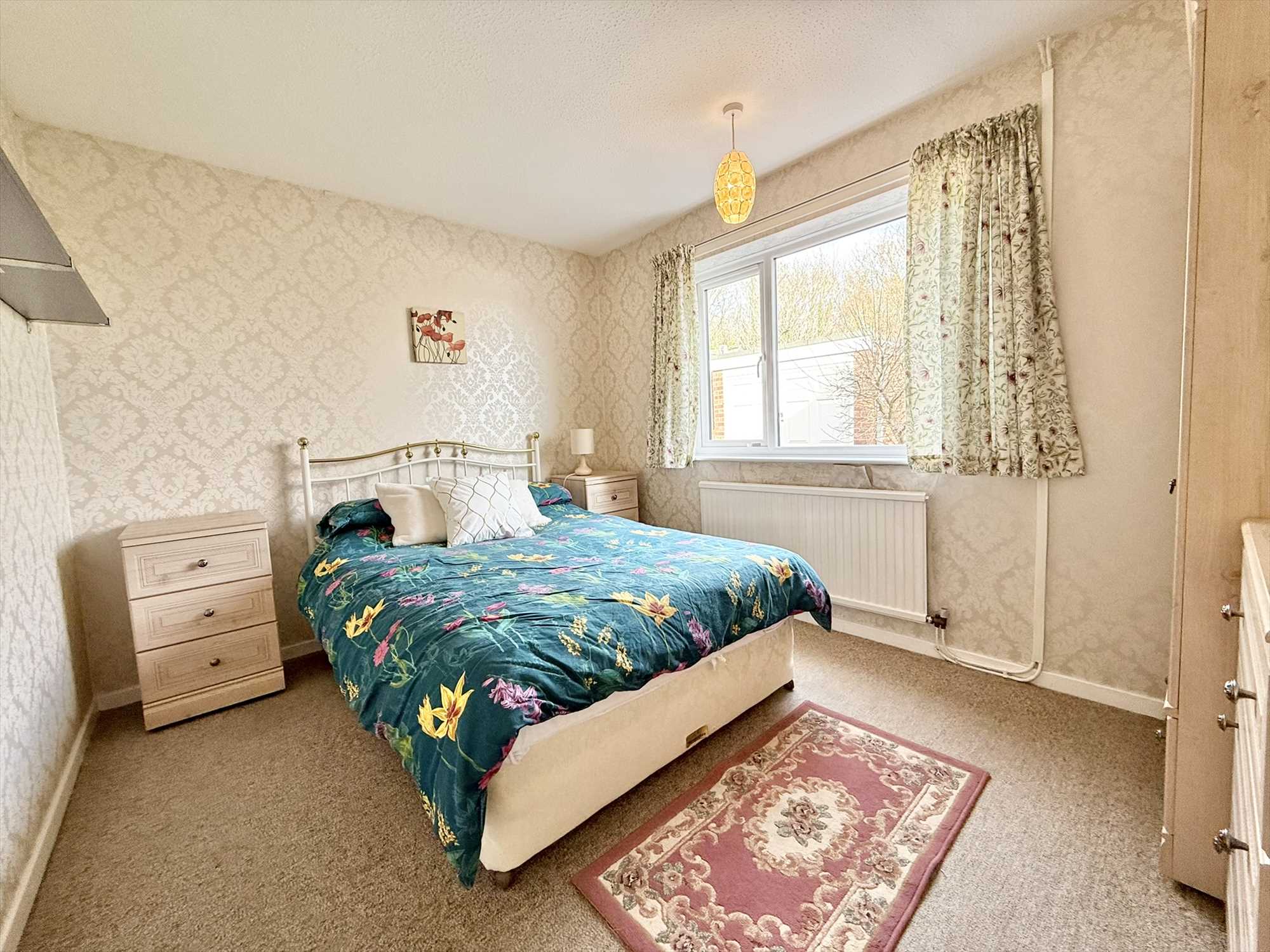 UPVC double glazed window to front aspect, two ceiling light pendants, electric feature fireplace, radiator, carpet.