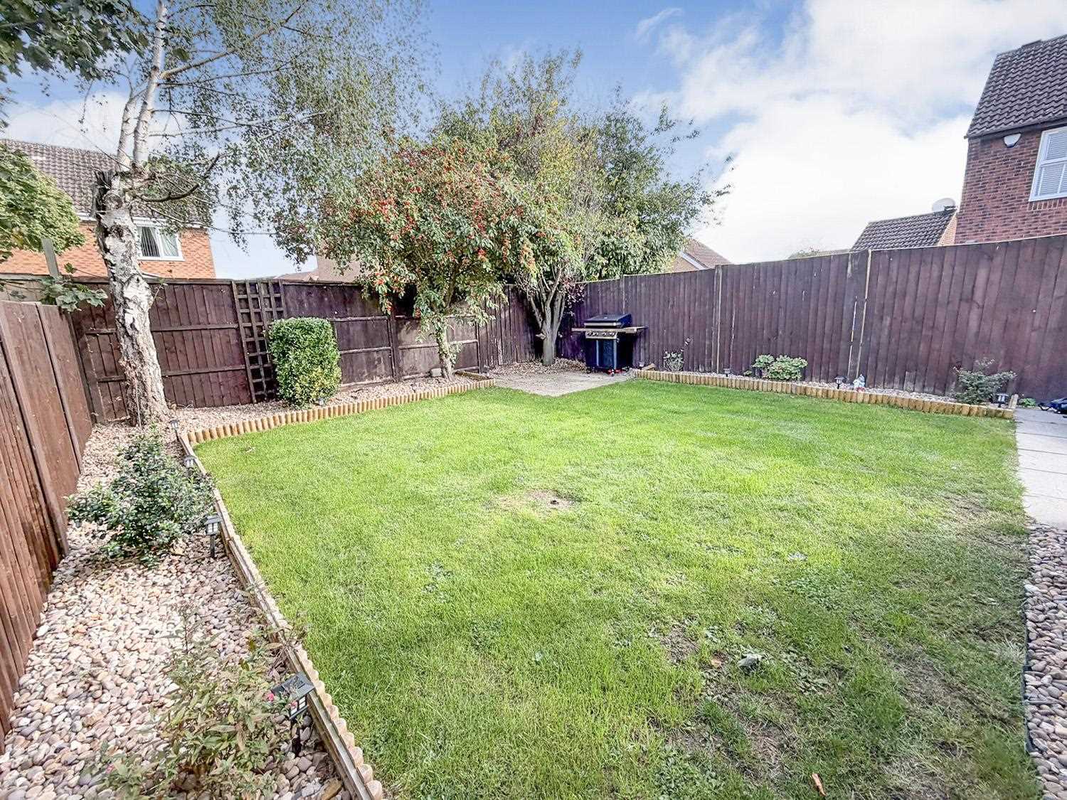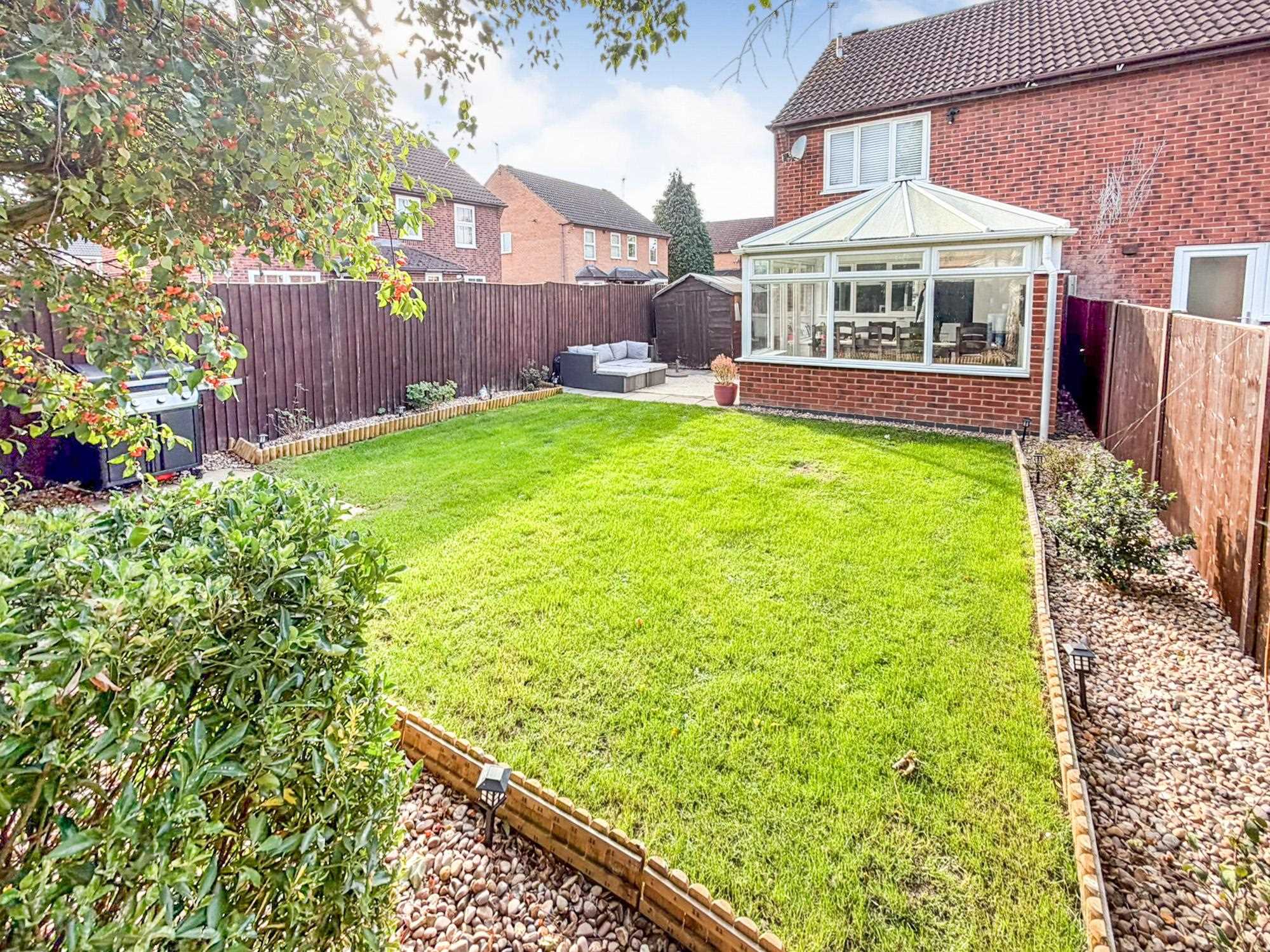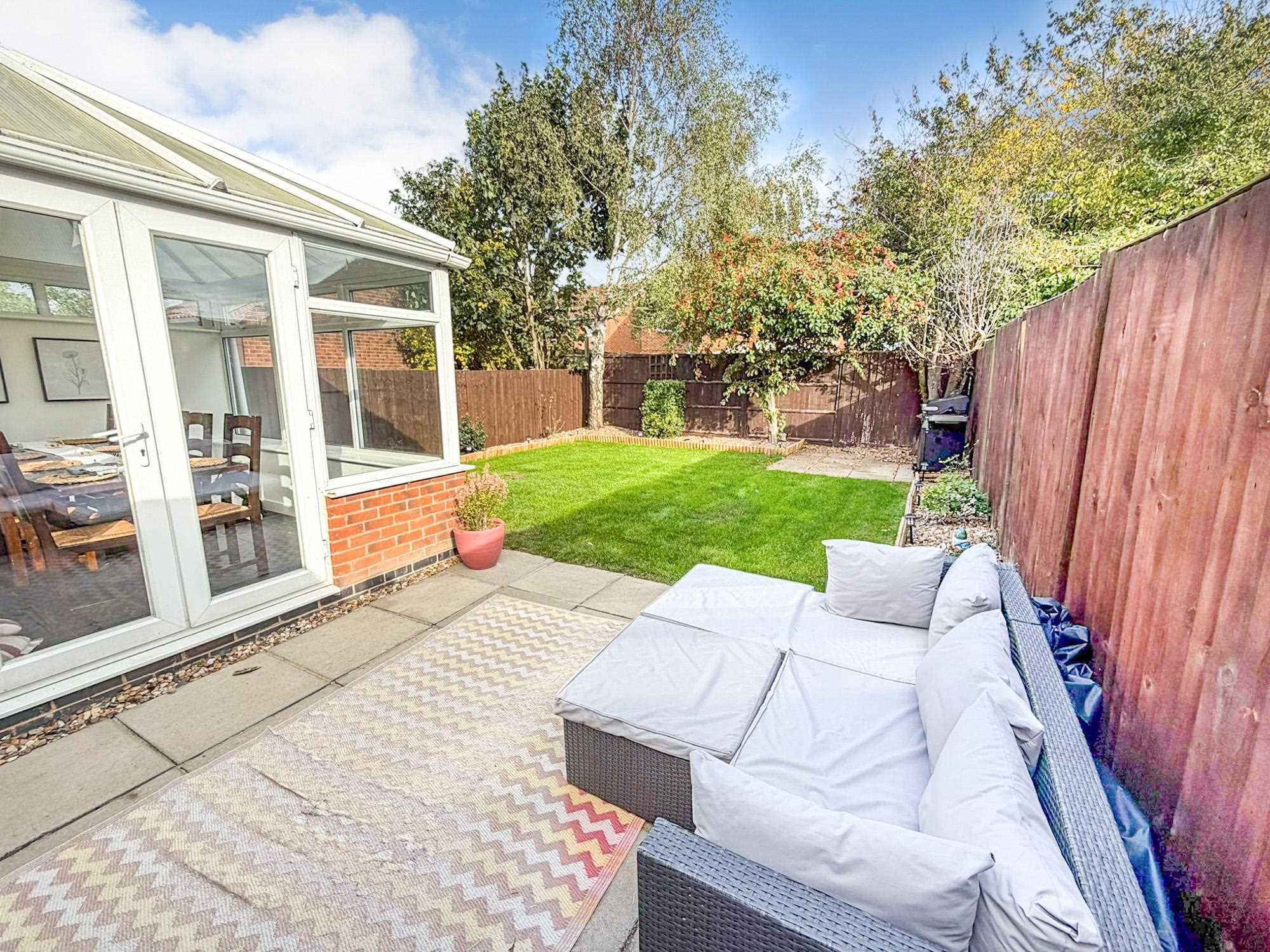 Gated access leads to the rear where a mainly laid to lawn garden, Patio area perfect for outdoor entertaining, garden shed, variety of plants, boarder flower beds and shrubbery and fencing to boundaries.