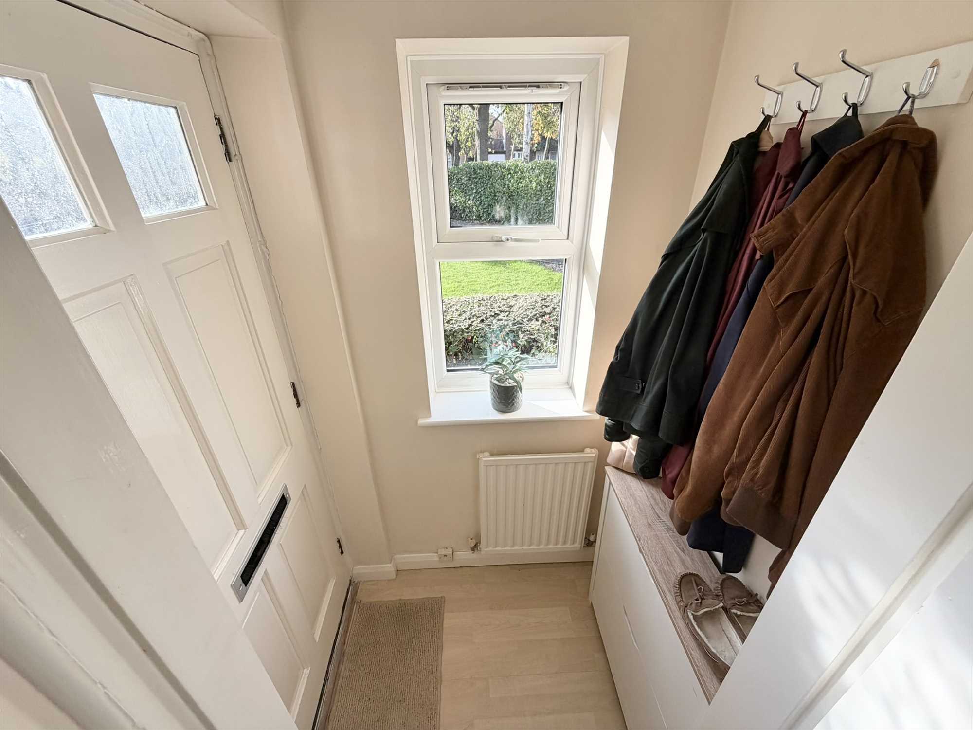 front door, double glazed window to front elevation, central heating radiator,