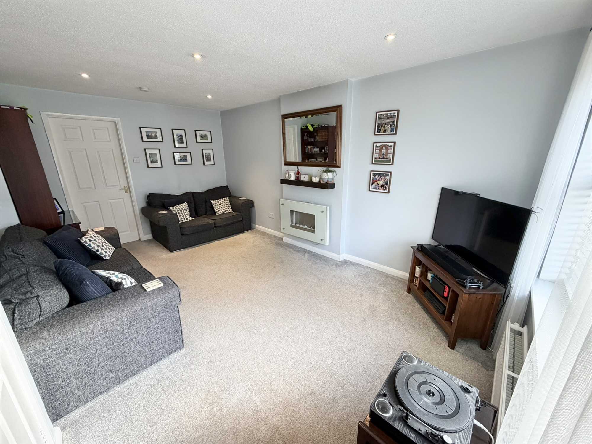 window to the front elevation, spotlights, radiators, mounted electric fire, door leading to kitchen.