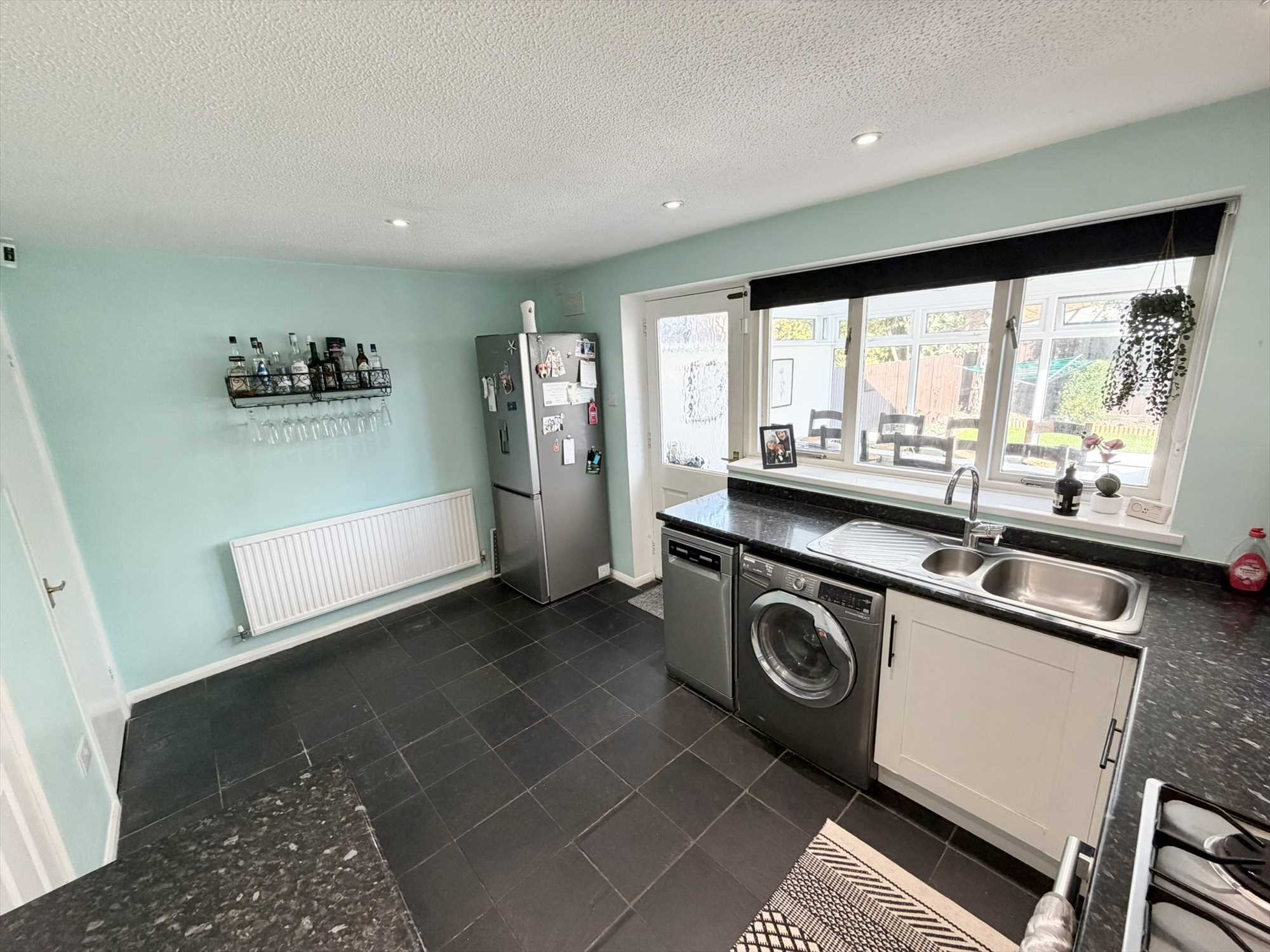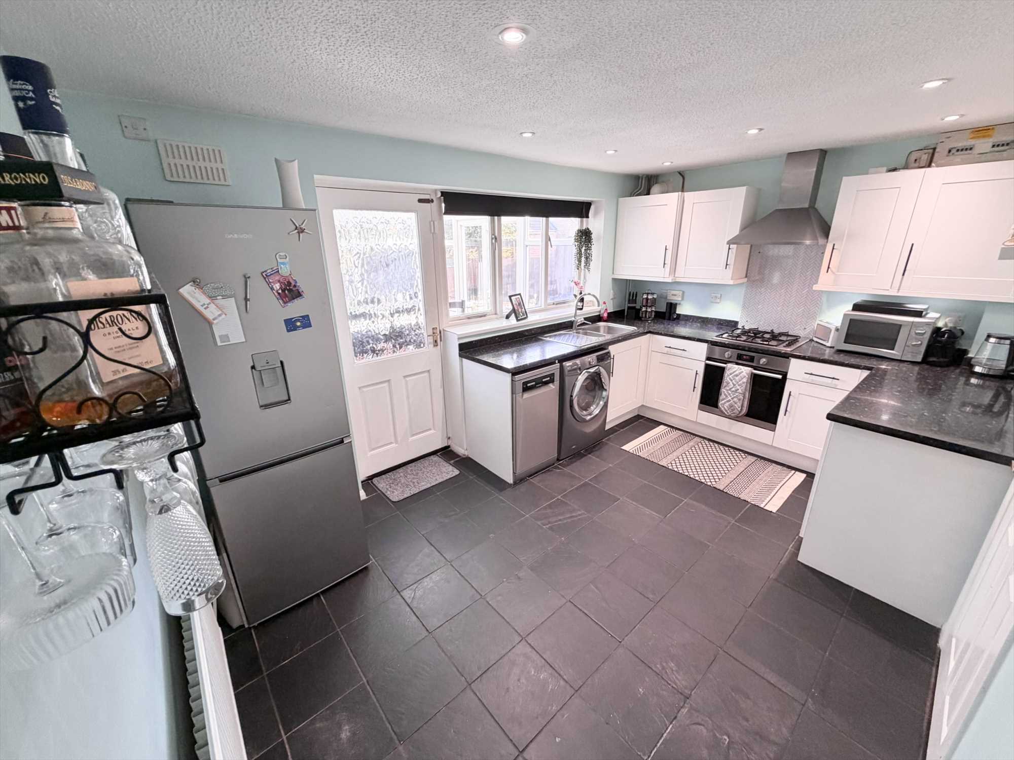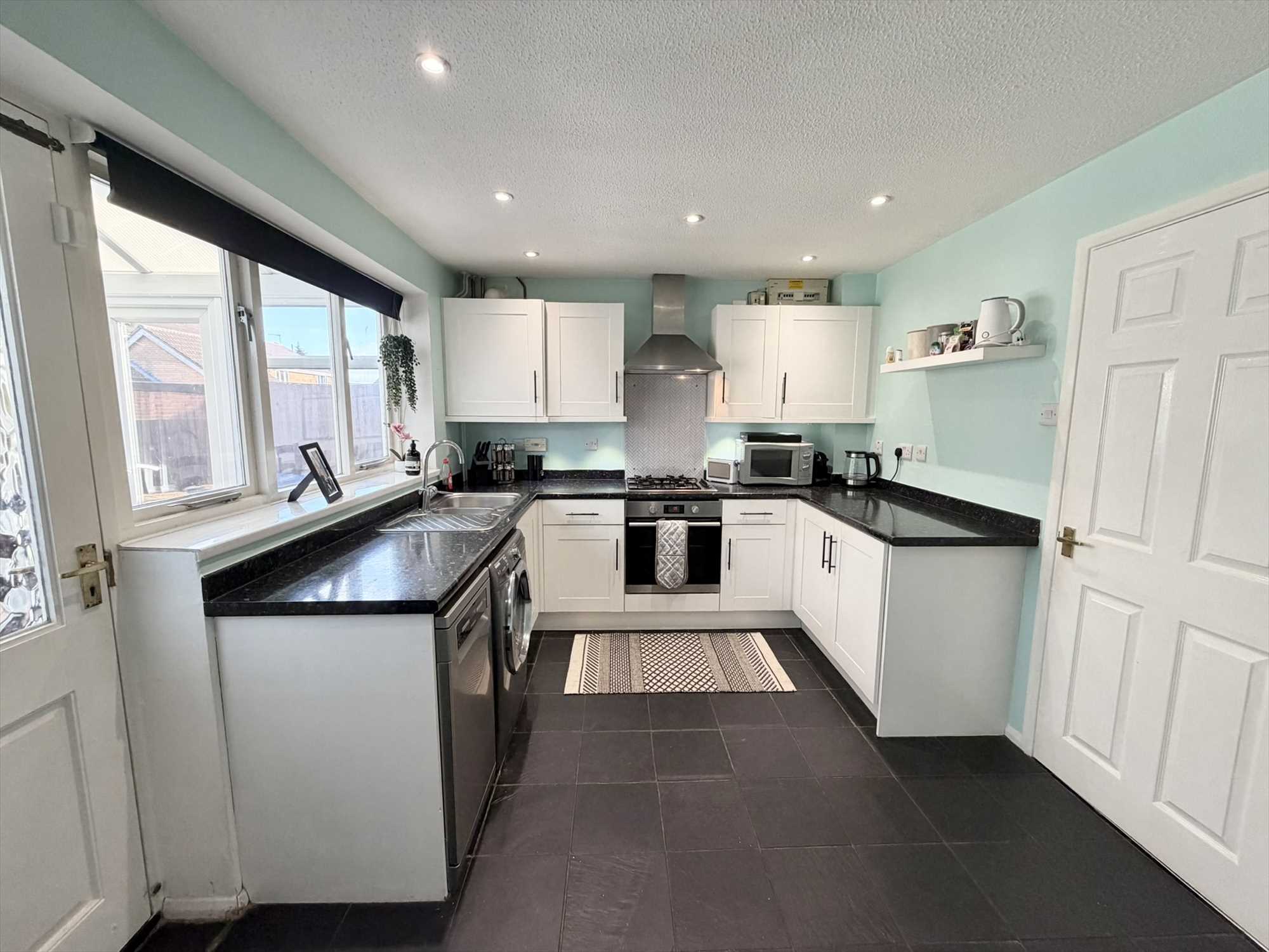 The full width kitchen diner is fitted with a range of wall and base shaker style kitchen units with rolled edge work surfaces over and tiled splashbacks. Features include an inset stainless steel sink and drainer with chrome mixer tap, electric oven, with extractor fan above, gas four ring hob, space for washing machine, fridge freezer and dishwasher. Cupboard housing Baxi Combi boiler, useful under stairs storage cupboard, central heating radiator, window to rear elevation, doors opening out into the rear conservatory.