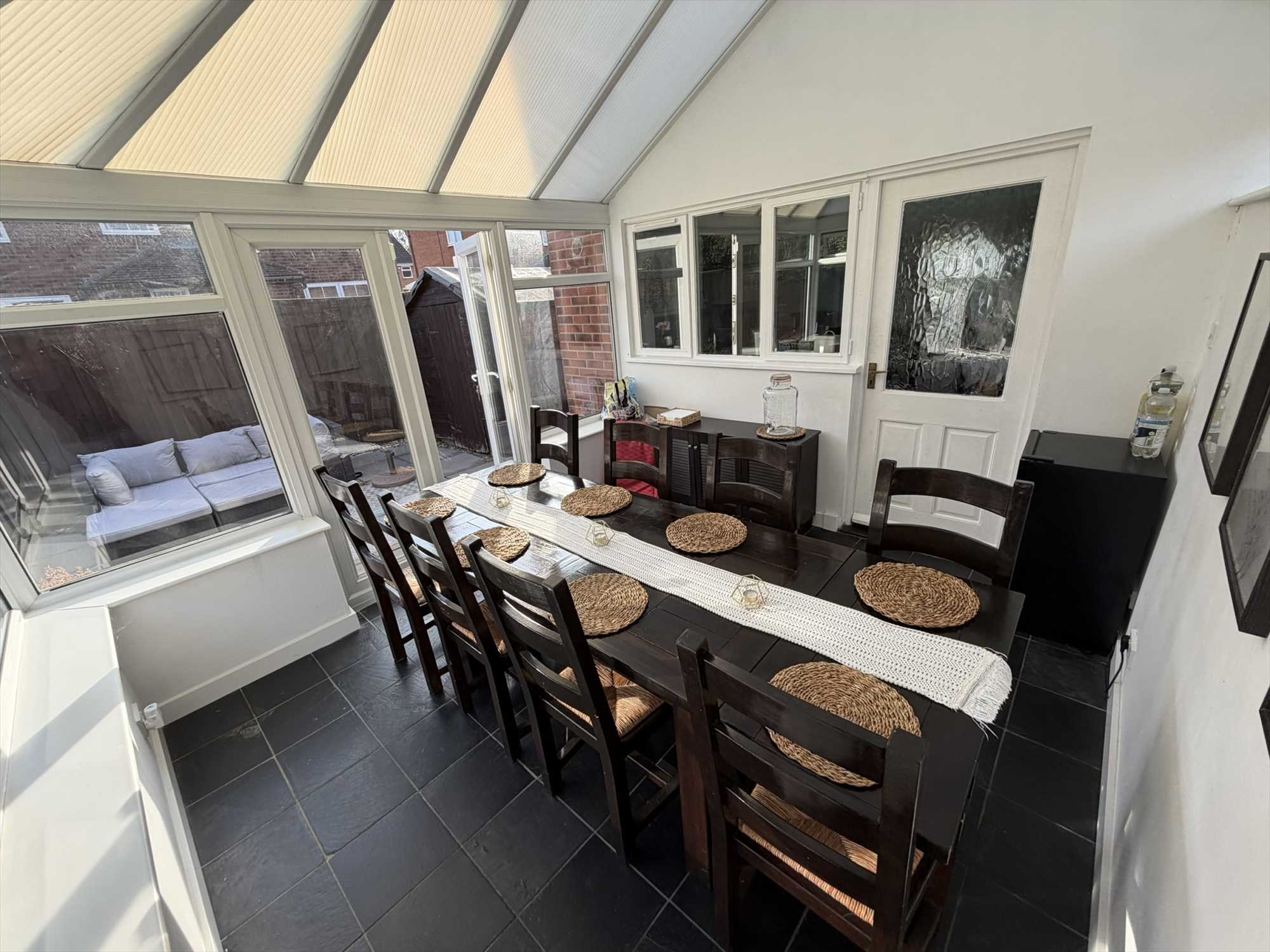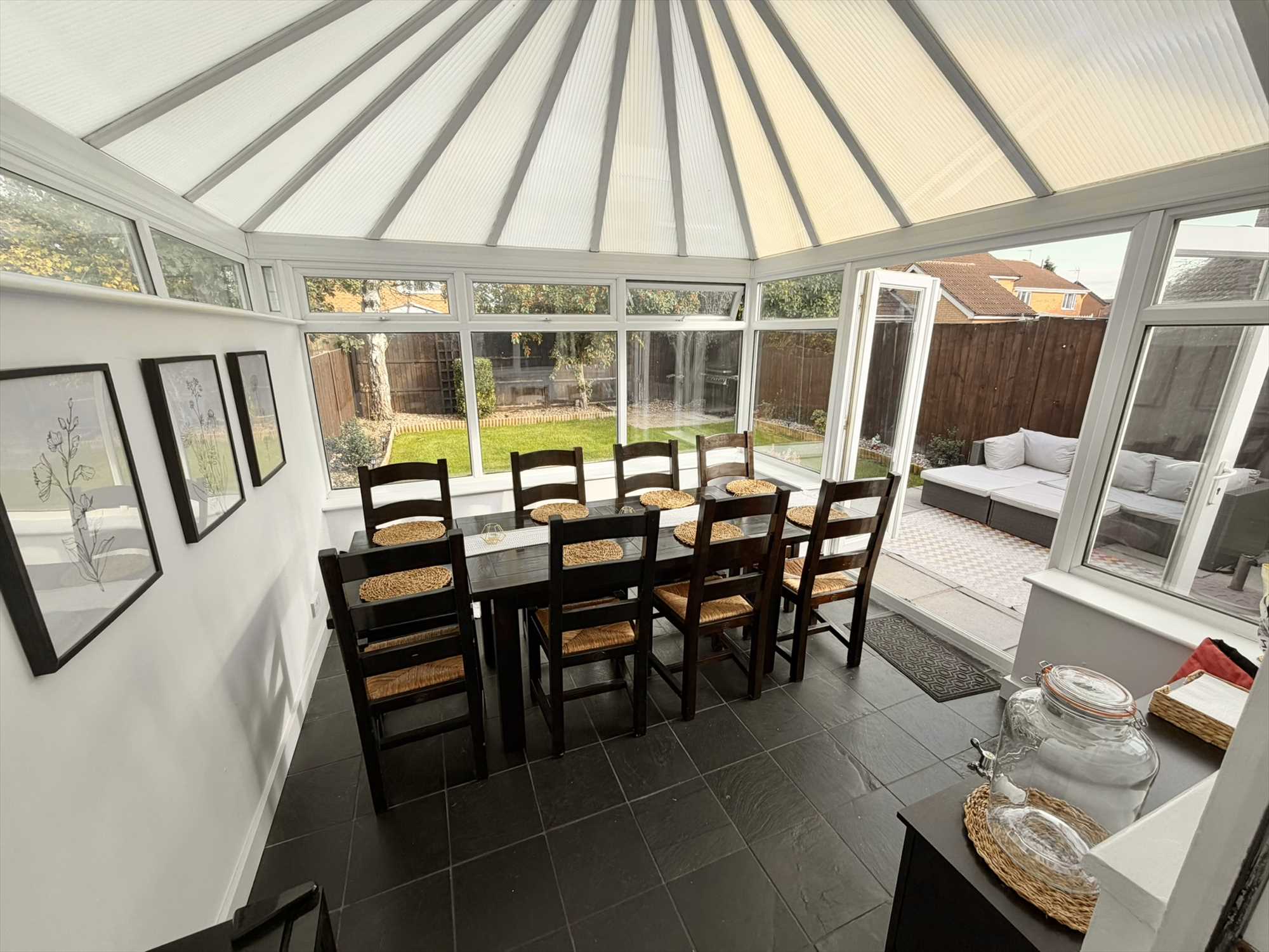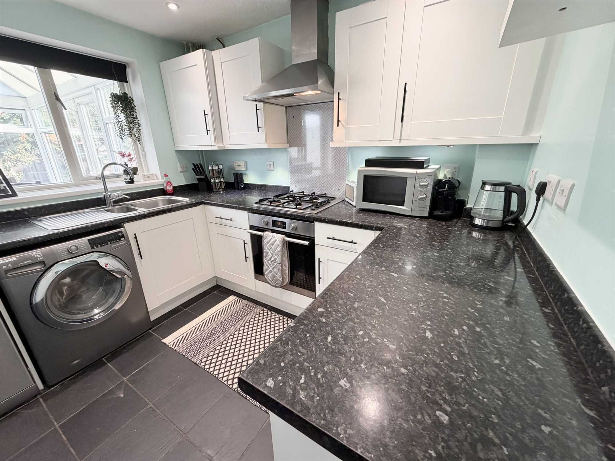 The full width kitchen diner is fitted with a range of wall and base shaker style kitchen units with rolled edge work surfaces over and tiled splashbacks. Features include an inset stainless steel sink and drainer with chrome mixer tap, electric oven, with extractor fan above, gas four ring hob, space for washing machine, fridge freezer and dishwasher. Cupboard housing Baxi Combi boiler, useful under stairs storage cupboard, central heating radiator, window to rear elevation, doors opening out into the rear conservatory.