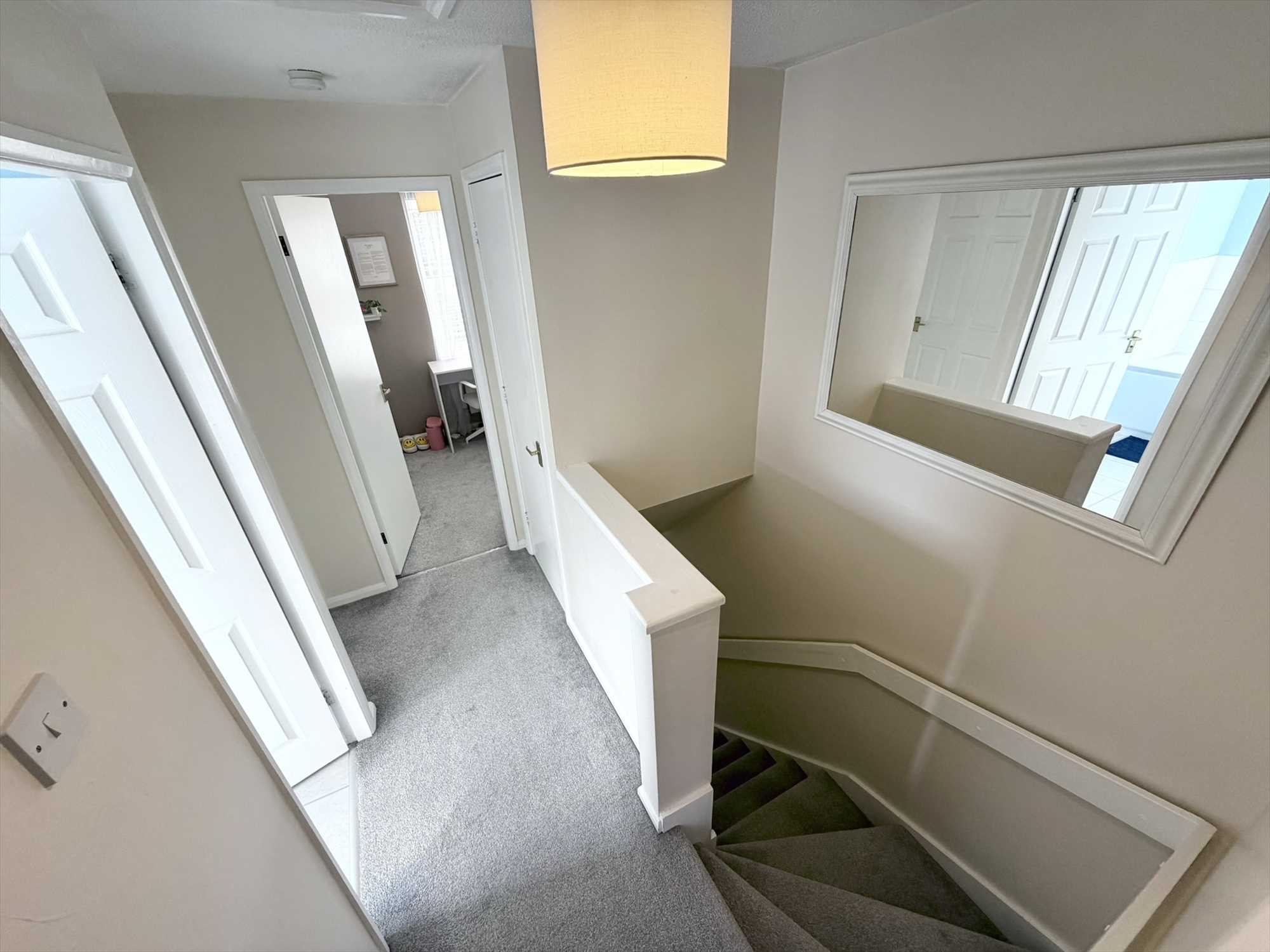 Giving access to the bedrooms and bathroom, with carpet flooring and a hatch to the loft space.