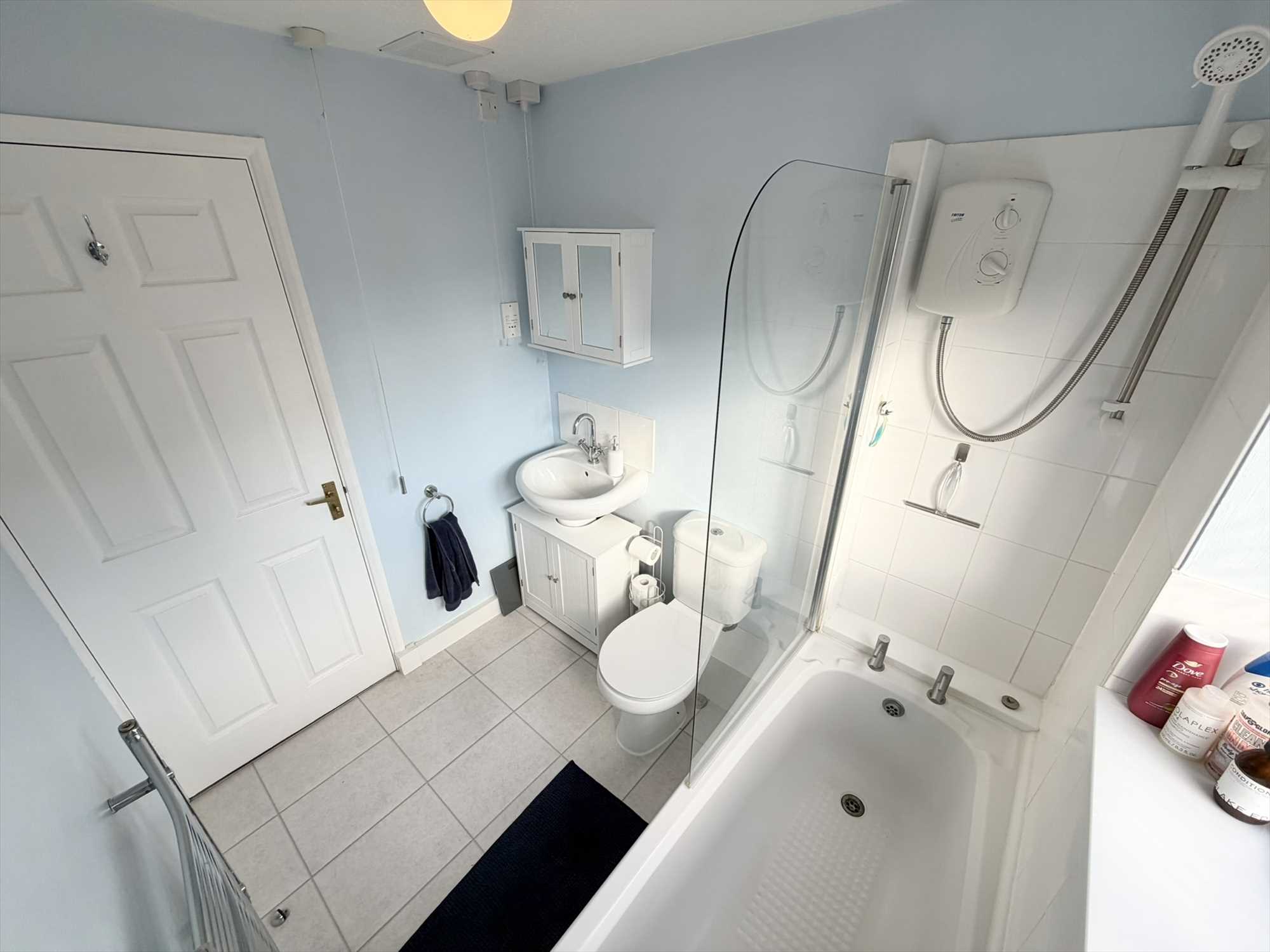 Fitted with a three piece suite comprising a panelled bath with Triton electric shower over, glass shower screen, half tiled walls, pedestal wash hand basin. low flush wc, towel radiator, obscure window to side elevation.