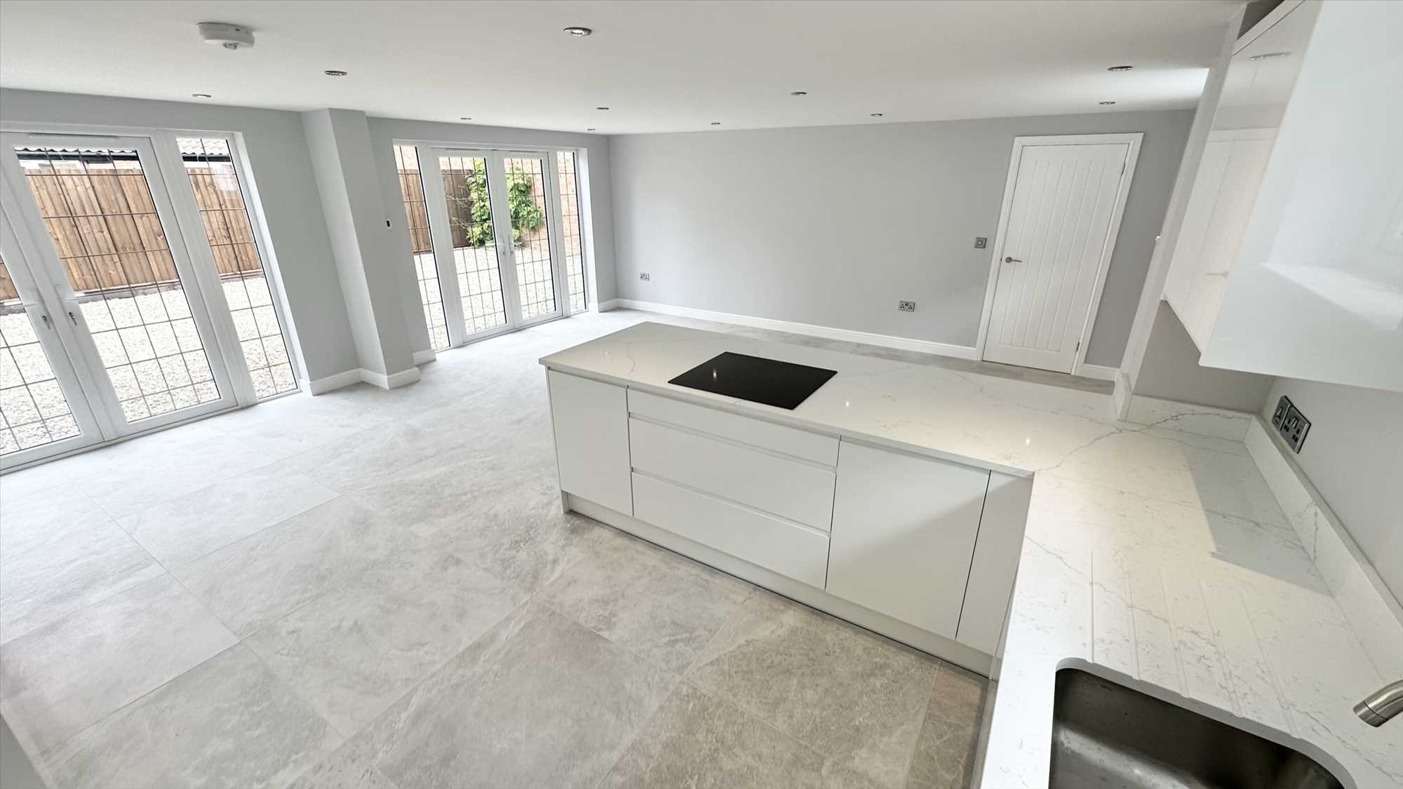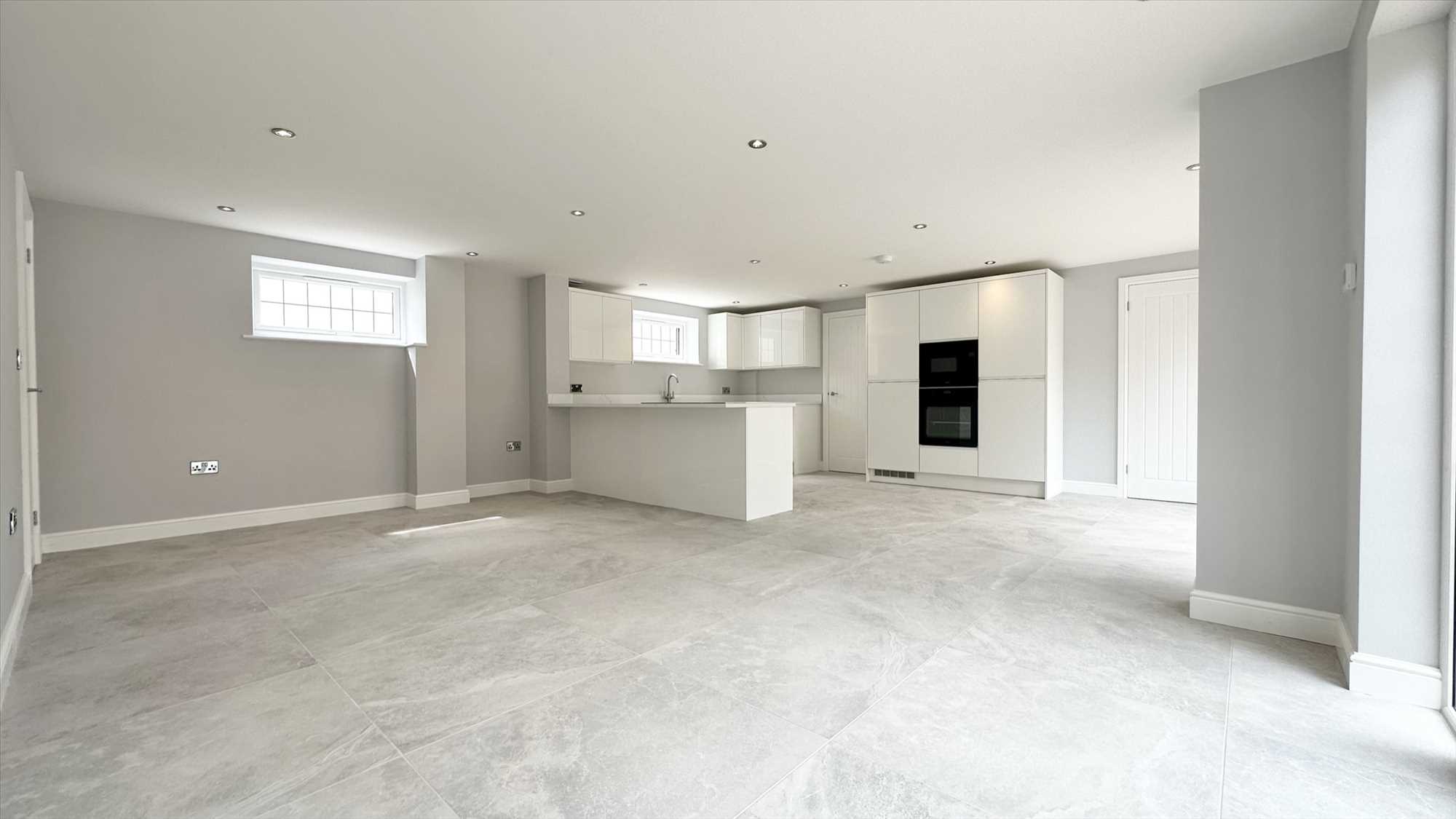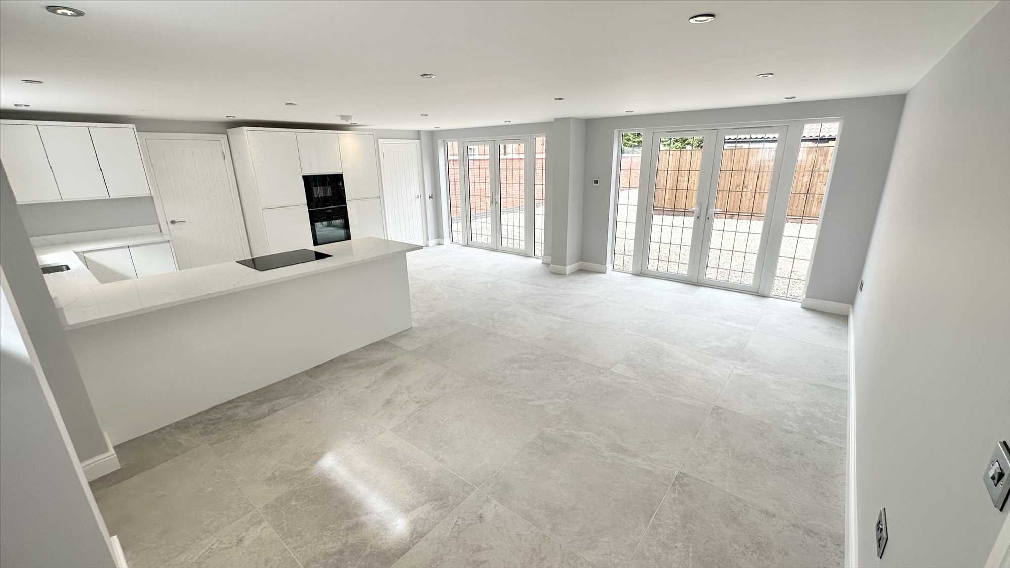 A large open plan kitchen diner with living space, a range of matching wall and base units, integrated Zanussi microwave and oven, Zanuddi induction hob, integrated Neff dishwasher, integrated fridge freezer, inset sink with mixer tap over. Porcelain tiled flooring, underfloor heating, upvc double glazed french doors to front aspect x2, upvc double glazed window to rear aspect and ceiling spotlights.