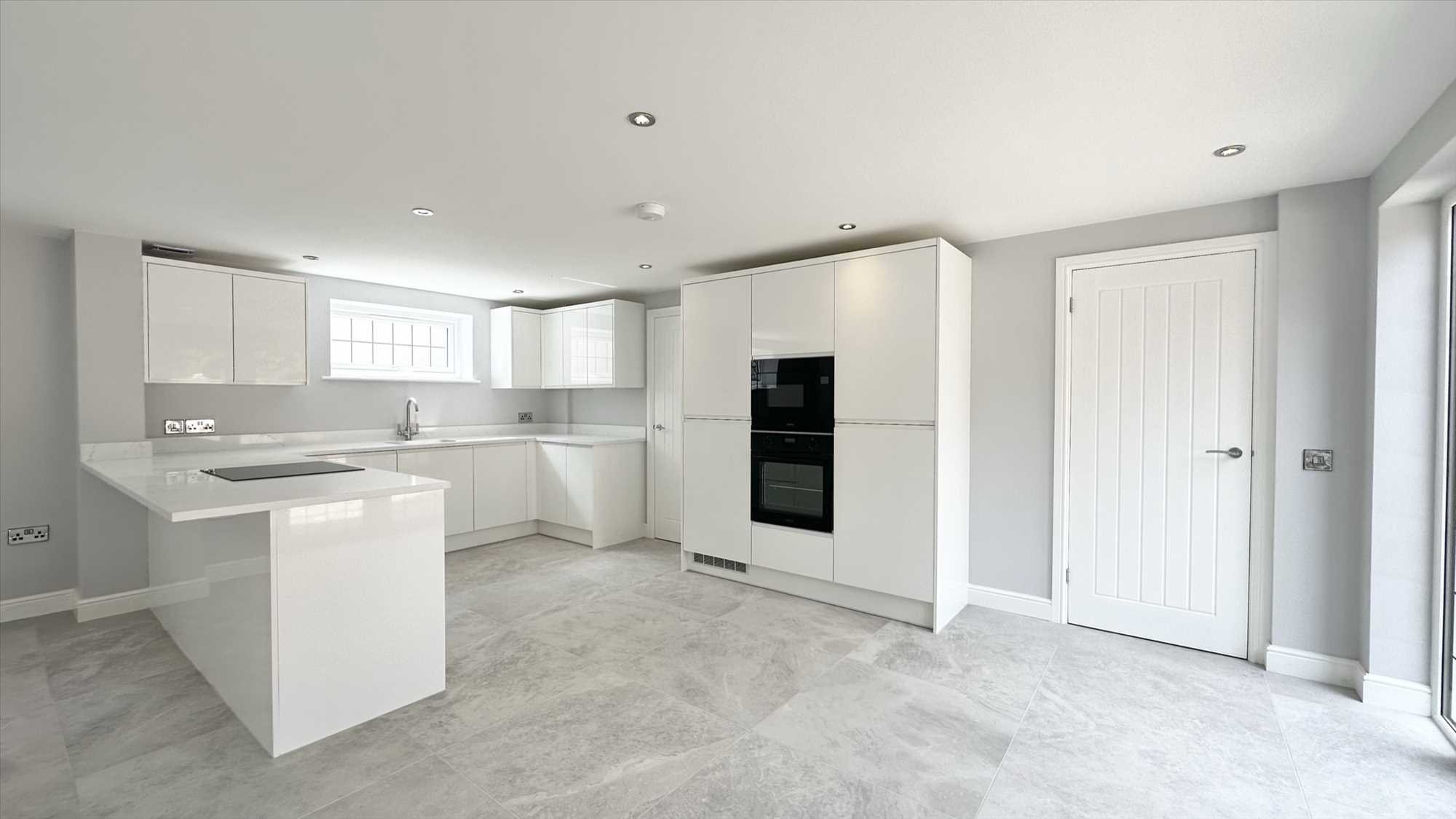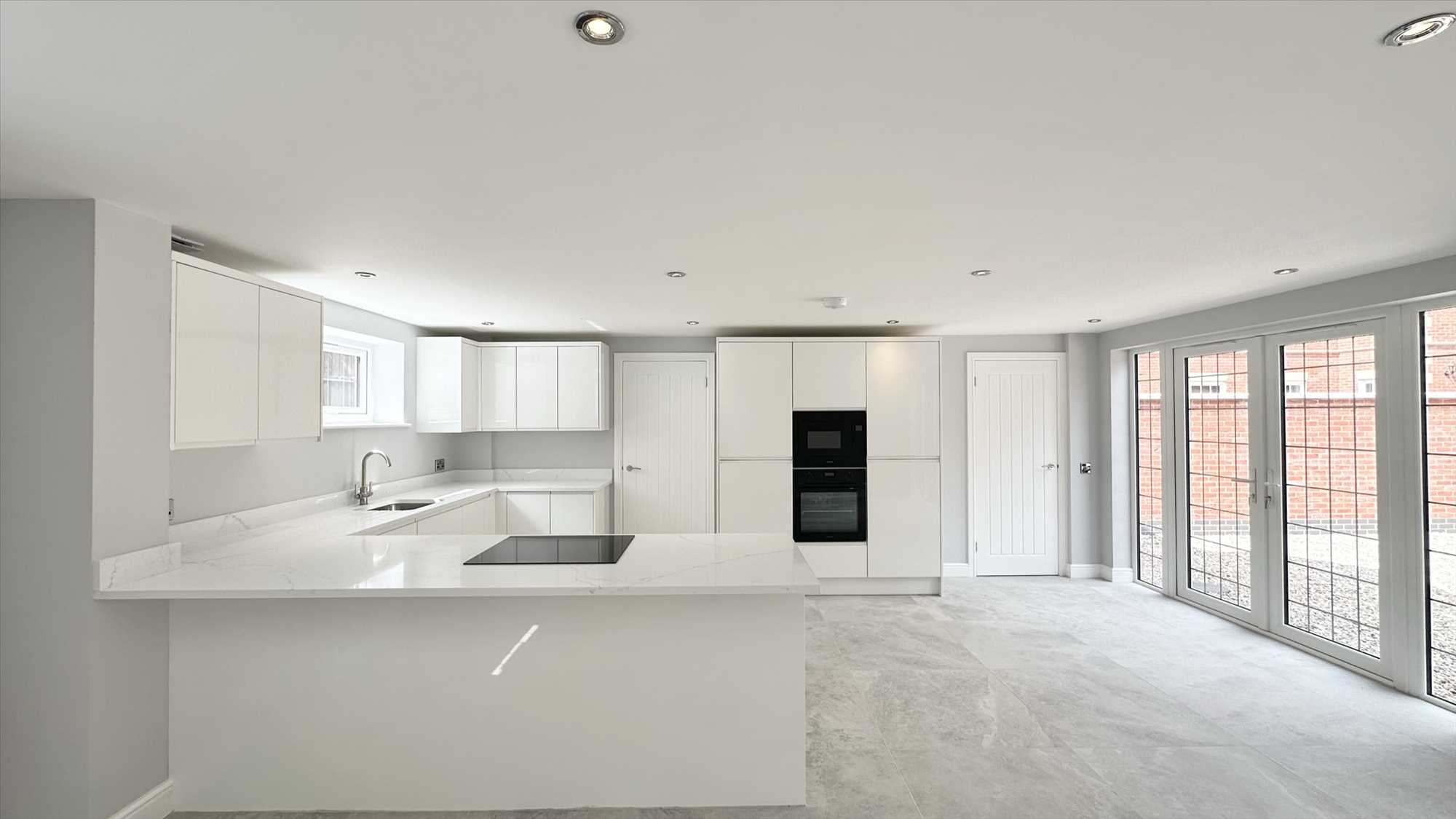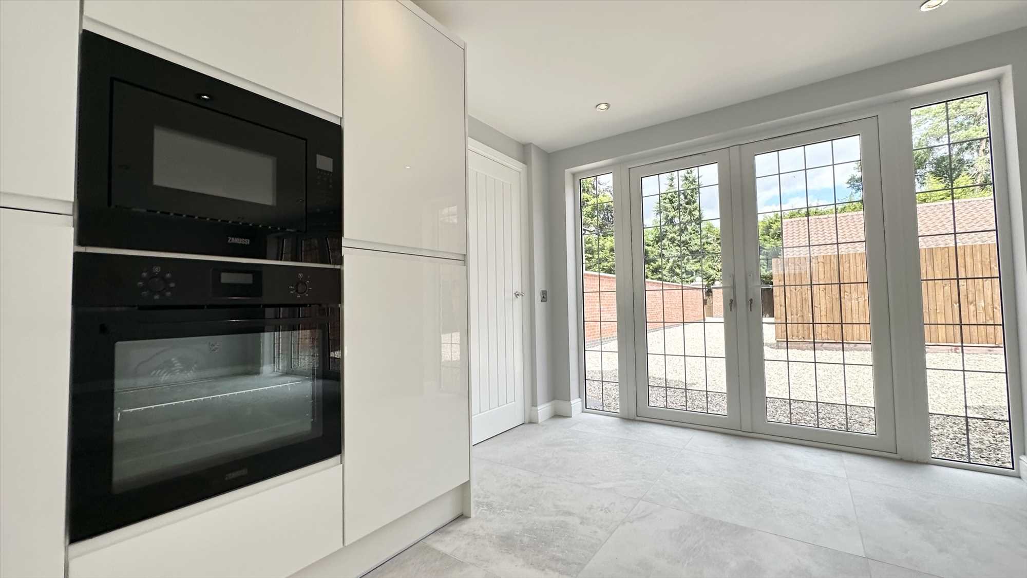 A large open plan kitchen diner with living space, a range of matching wall and base units, integrated Zanussi microwave and oven, Zanuddi induction hob, integrated Neff dishwasher, integrated fridge freezer, inset sink with mixer tap over. Porcelain tiled flooring, underfloor heating, upvc double glazed french doors to front aspect x2, upvc double glazed window to rear aspect and ceiling spotlights.