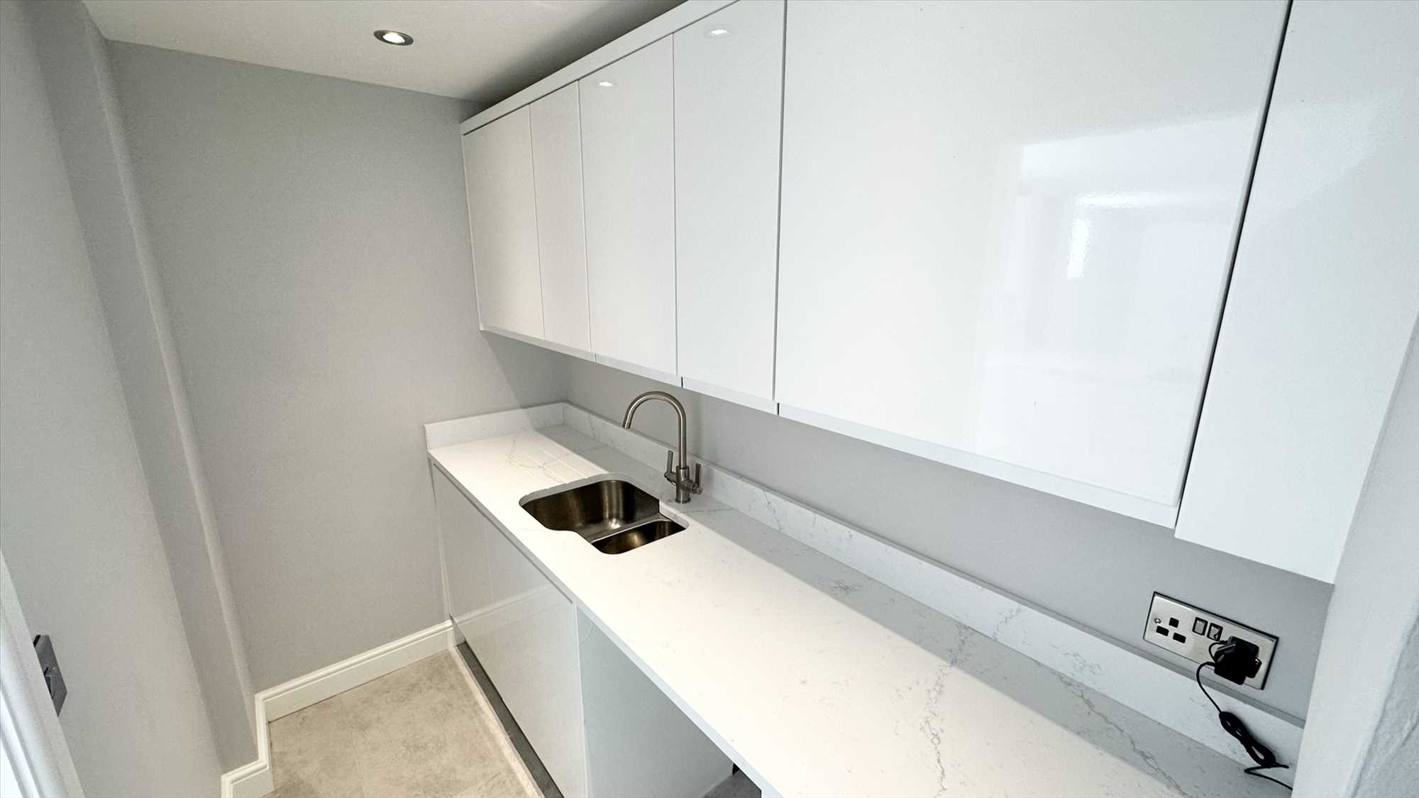A range of matching wall and base units, inset sink with mixer tap over, plumbing for washing machine and ceiling spotlights.