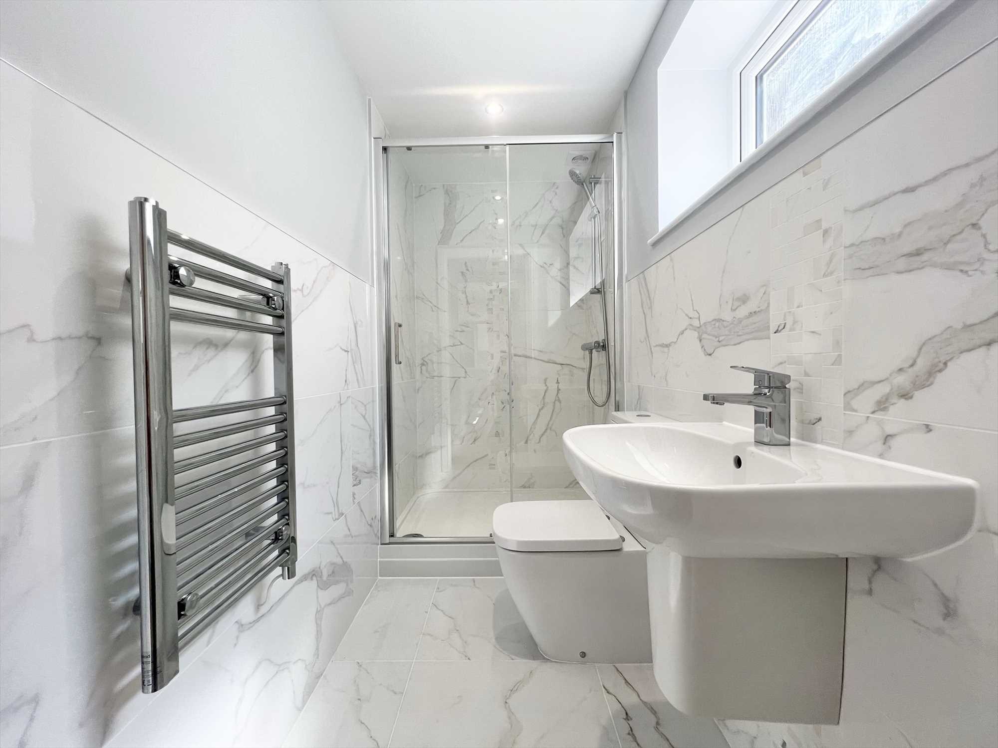 Upvc double glazed window to rear aspect, three piece white suite comprising; low level wc, hand wash basin and corner shower cubicle. Marble effect tiled flooring and partly tiled walls. chrome heated towel rail, extractor fan and ceiling spotlights.