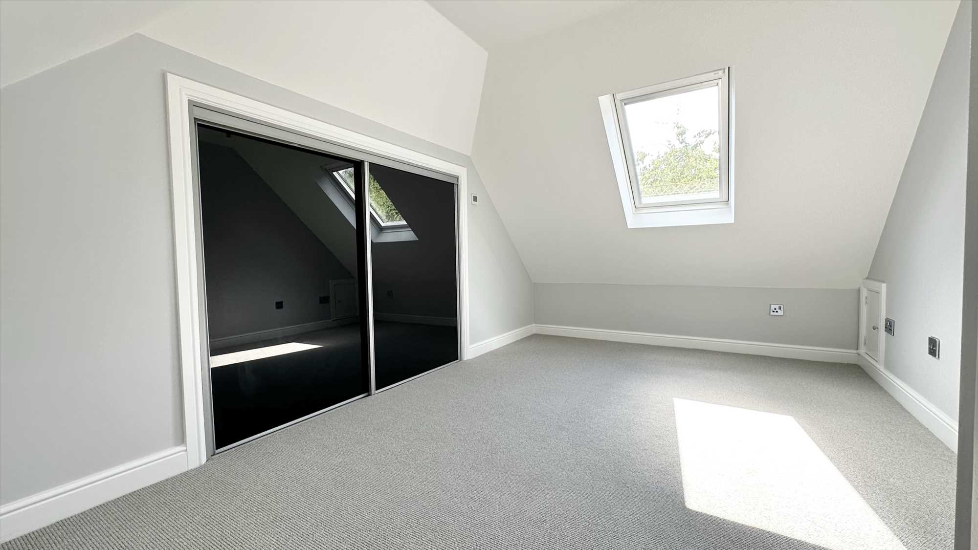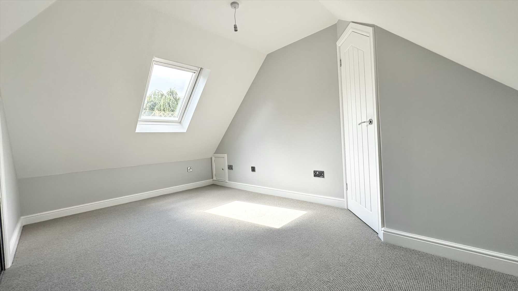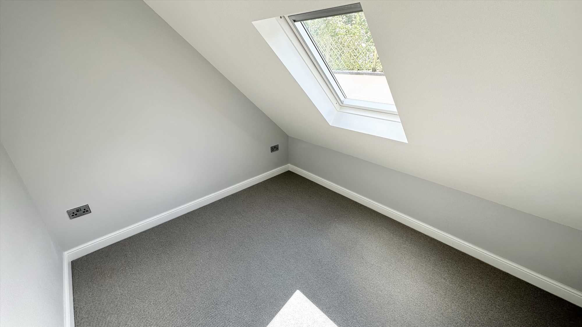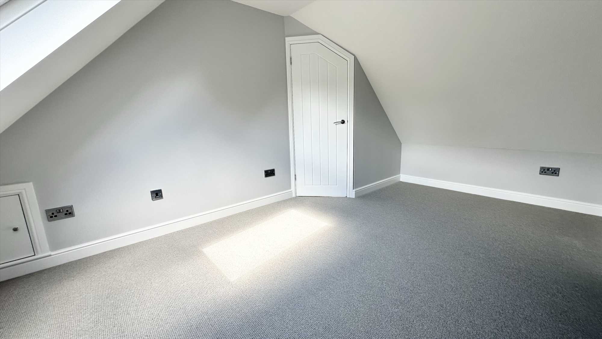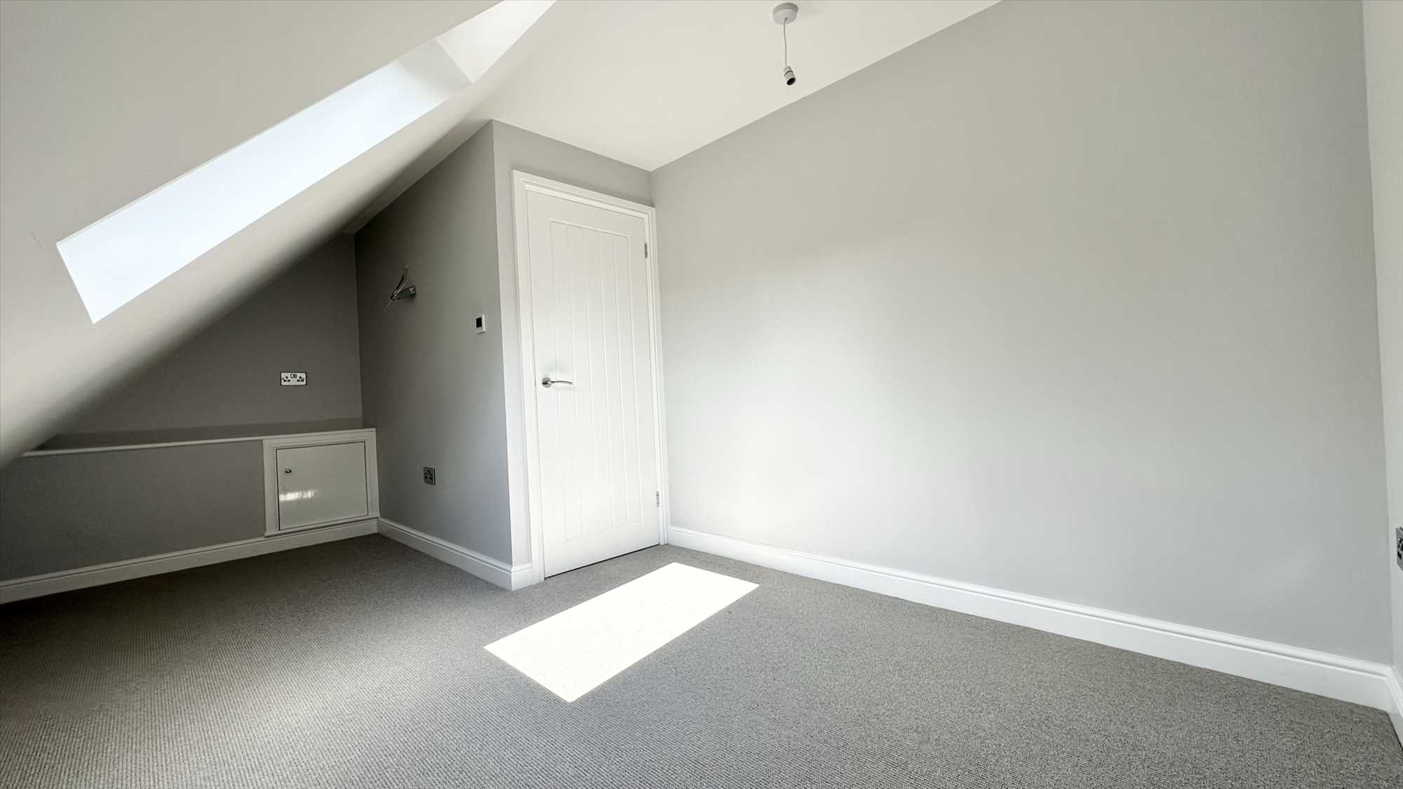 Velux window, carpet to flooring, built in storage cupboard and ceiling light pendant.
