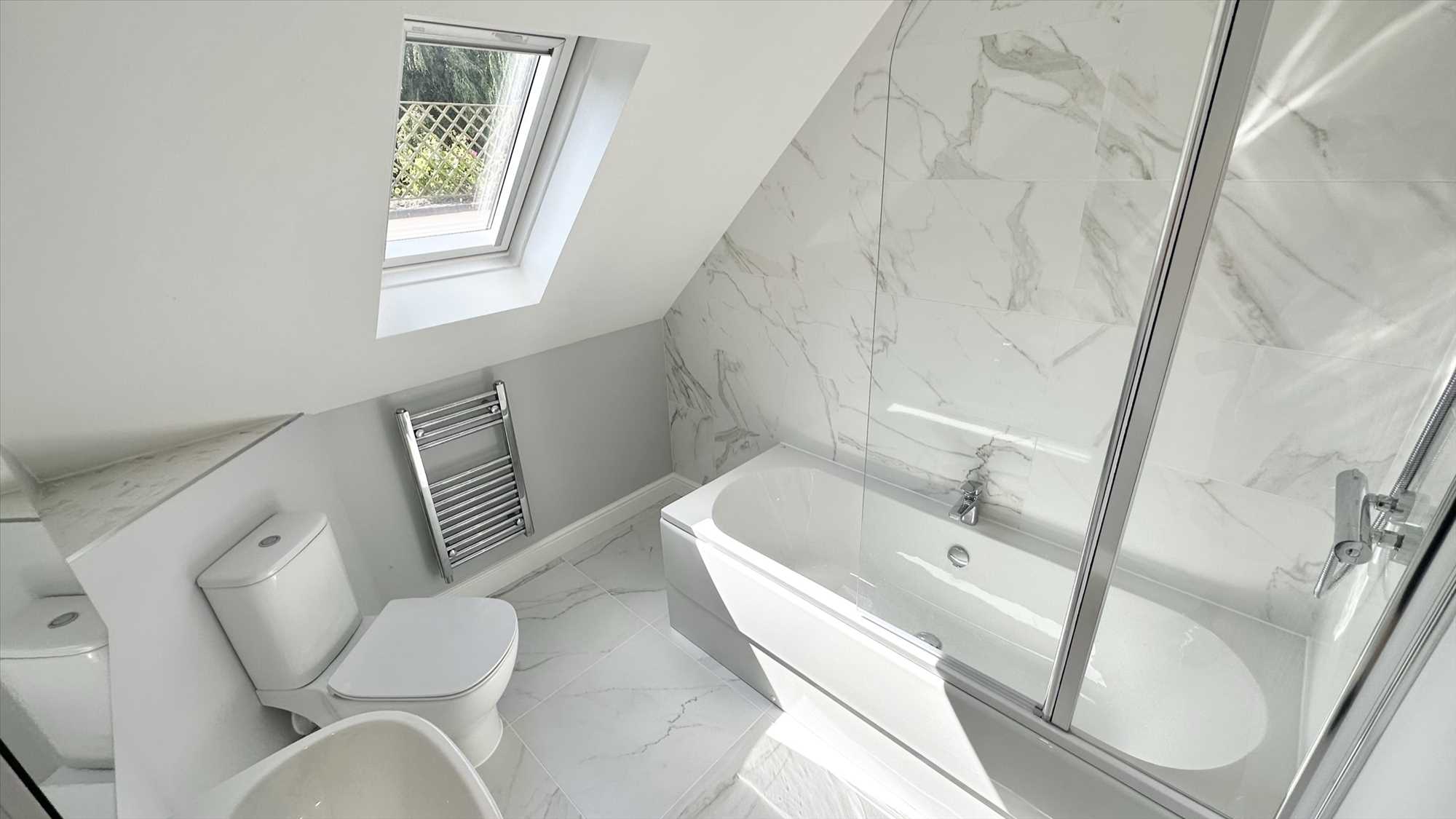 Three piece white suite comprising low level wc, wash basin, bath with shower screen and shower over, tiled flooring and partly tiled walls, chrome heated towel rail, velux window and ceiling light point.