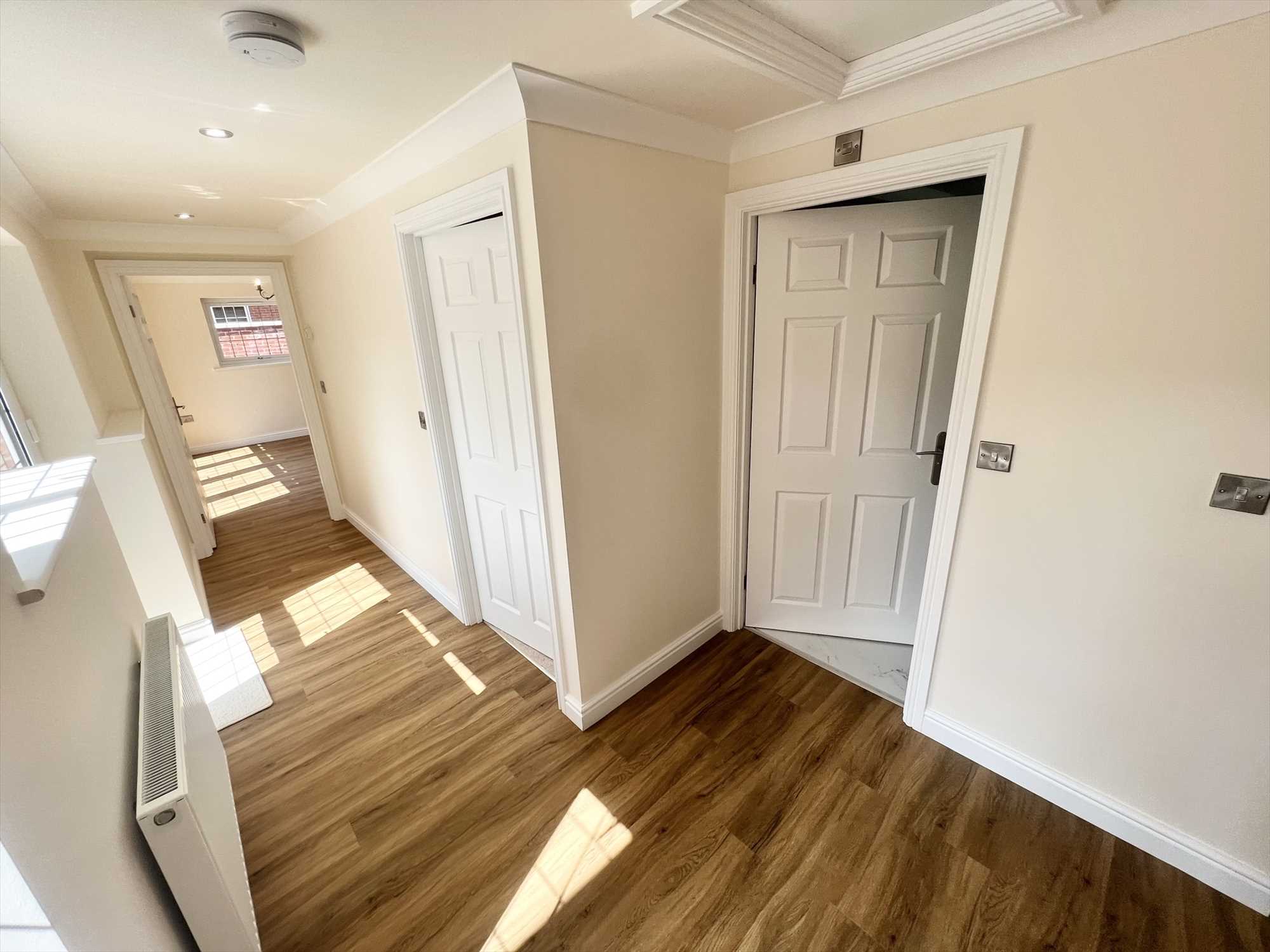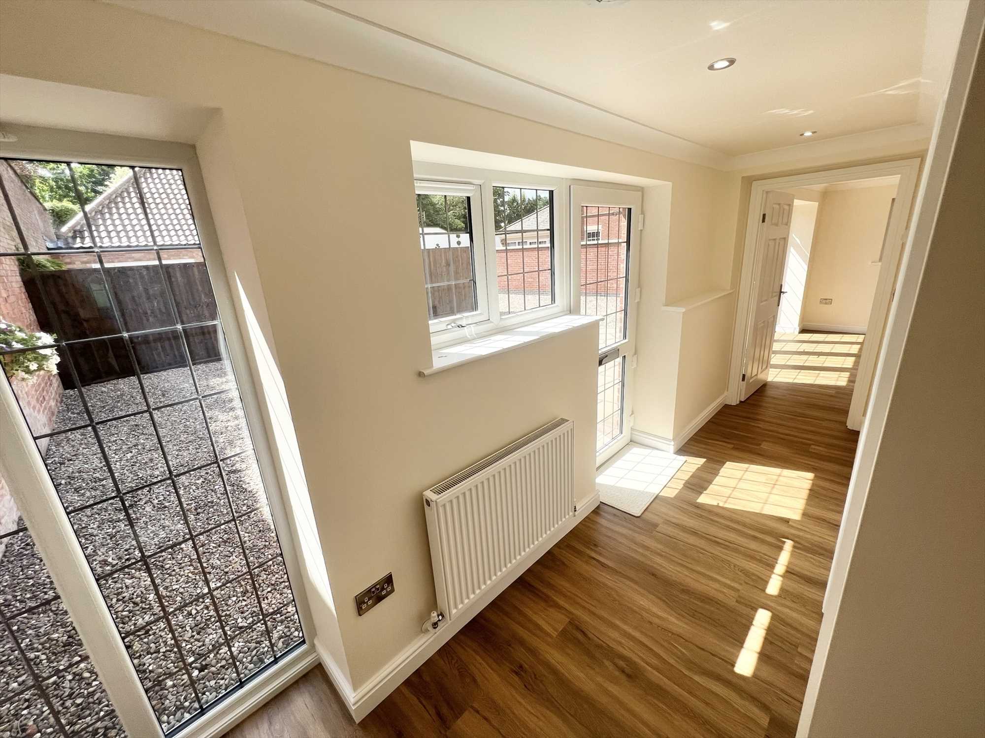 Upvc double glazed door leading in and upvc double glazed windows to front aspect, wooden effect flooring, radiator, ceiling spotlights and access into;