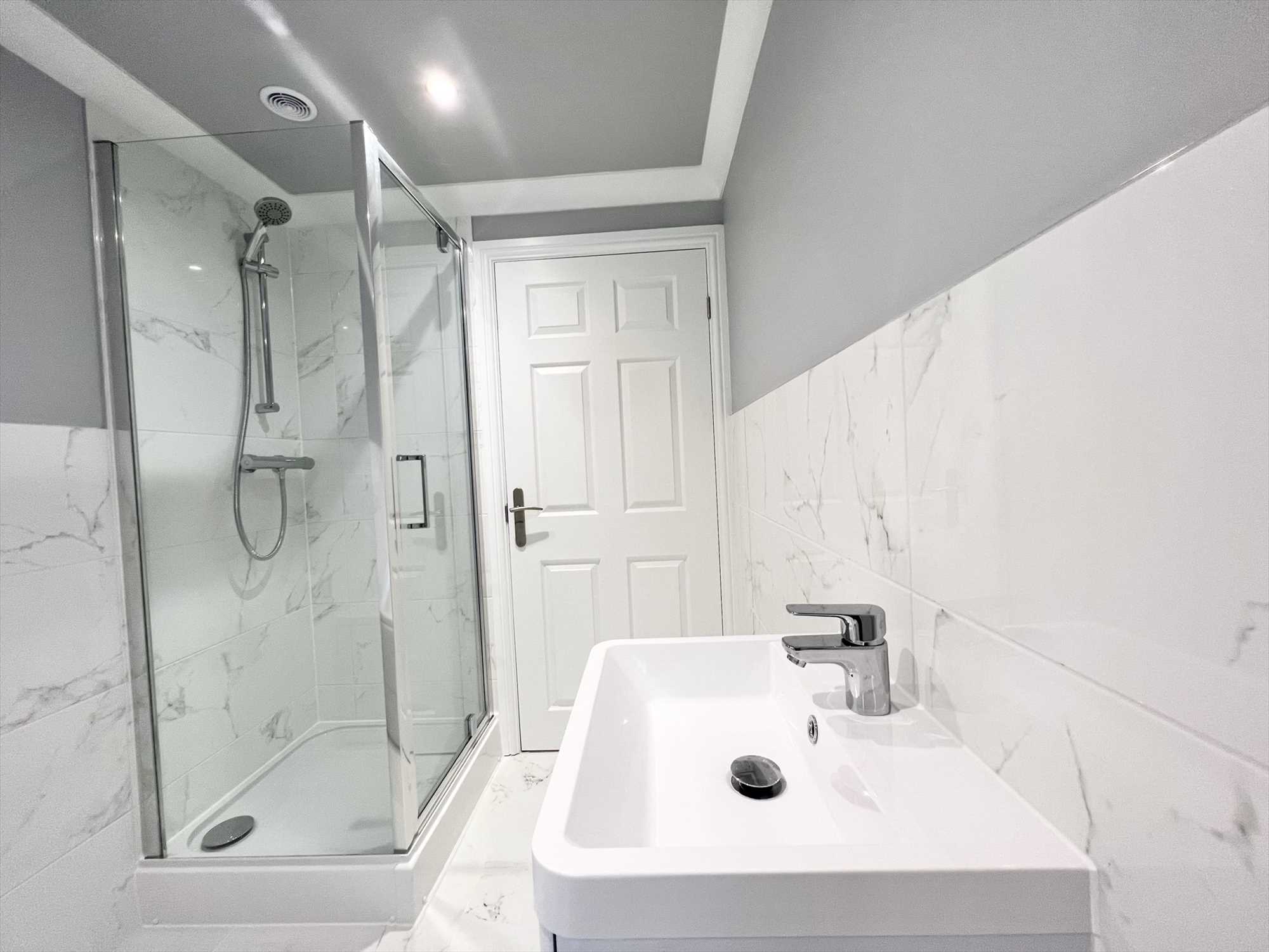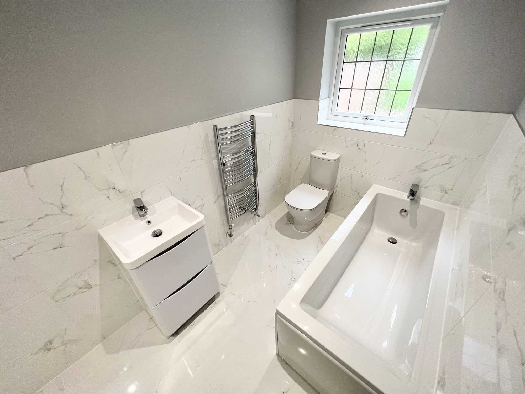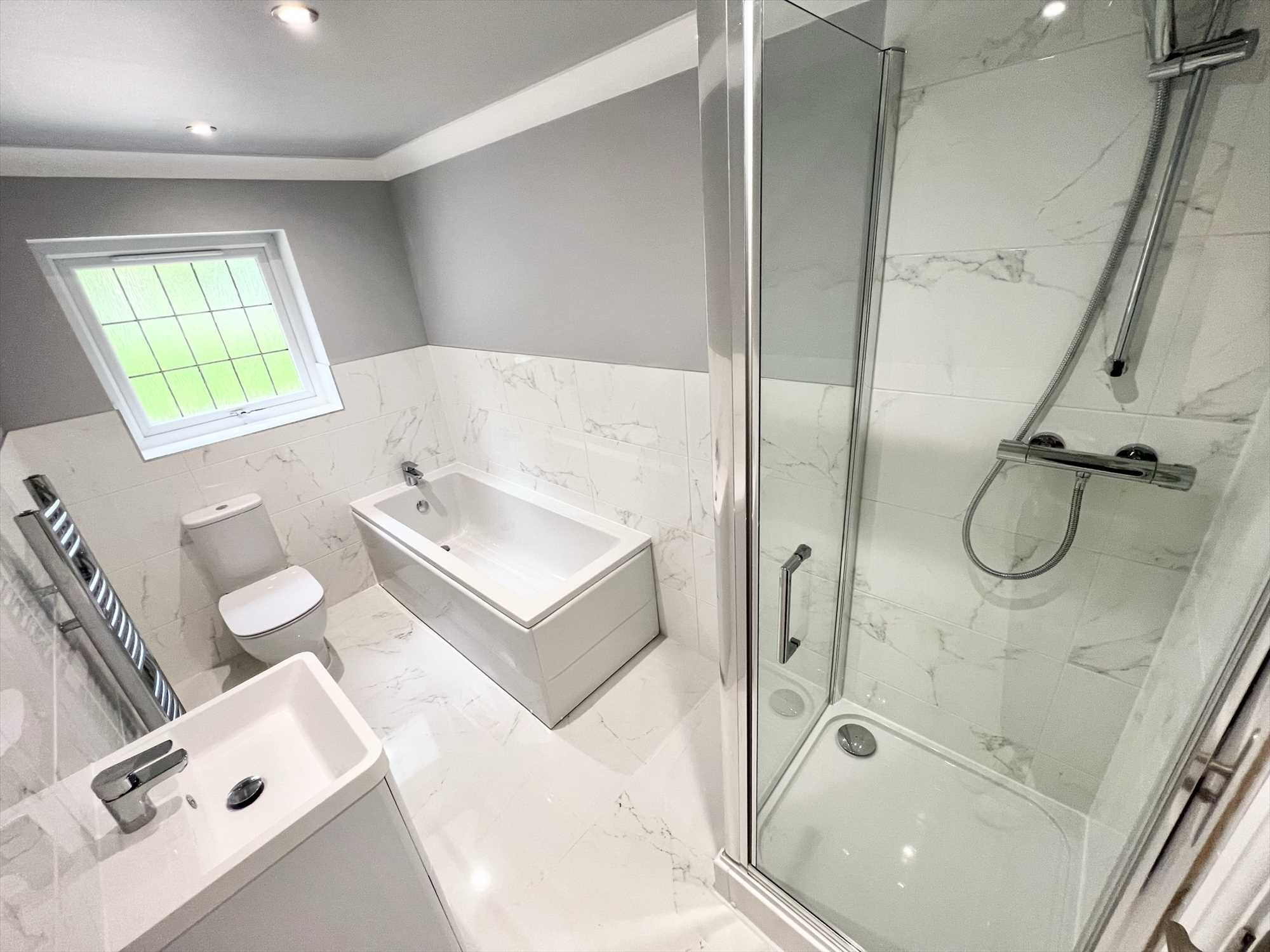 Upvc double glazed window to rear aspect, four piece suite white suite comprising; low level wc, vanity hand wash basin, bath and corner shower cubicle. Tiled flooring and partly tiled walls, chrome heated towel rail, extractor fan and ceiling spotlights.
