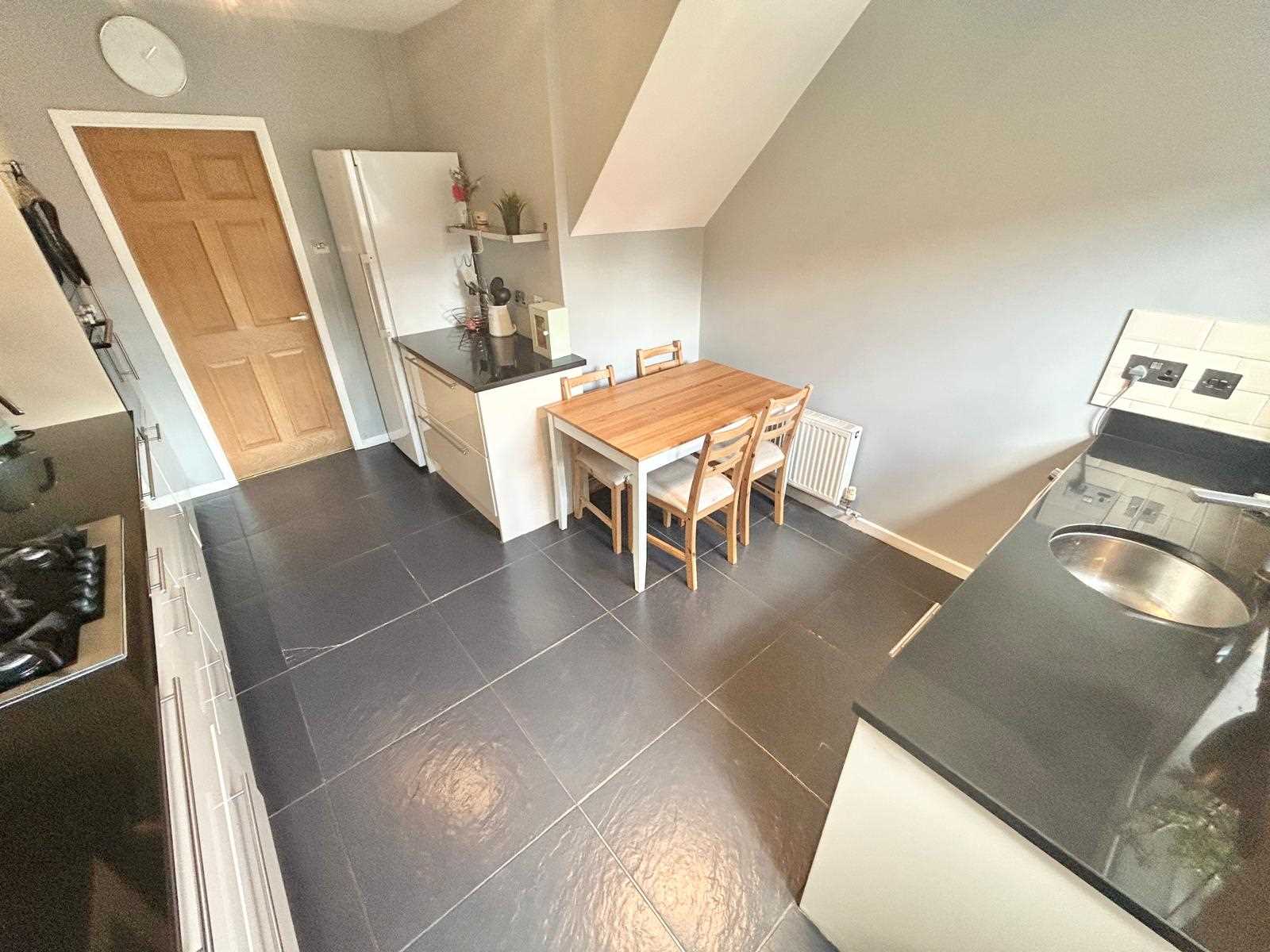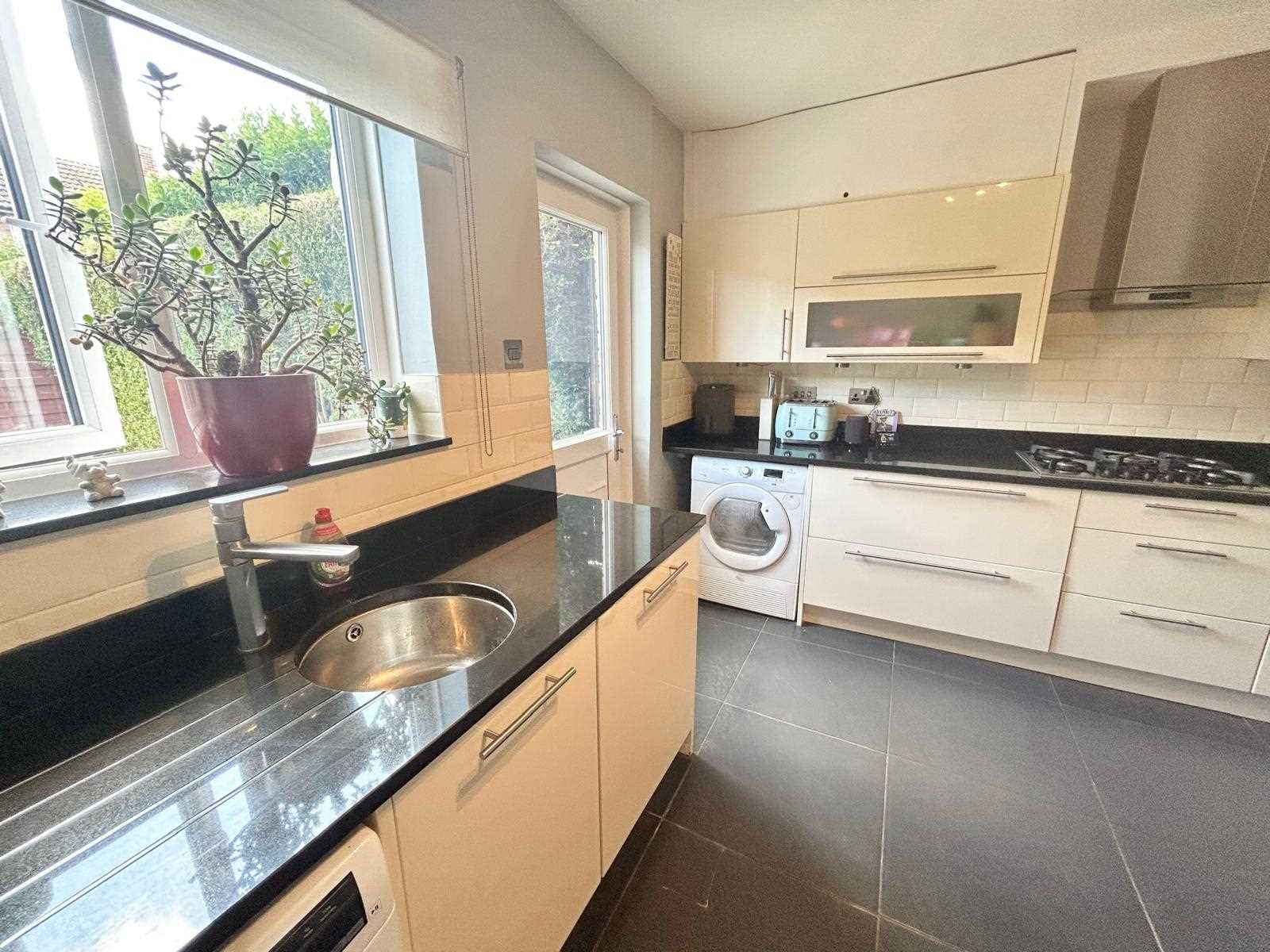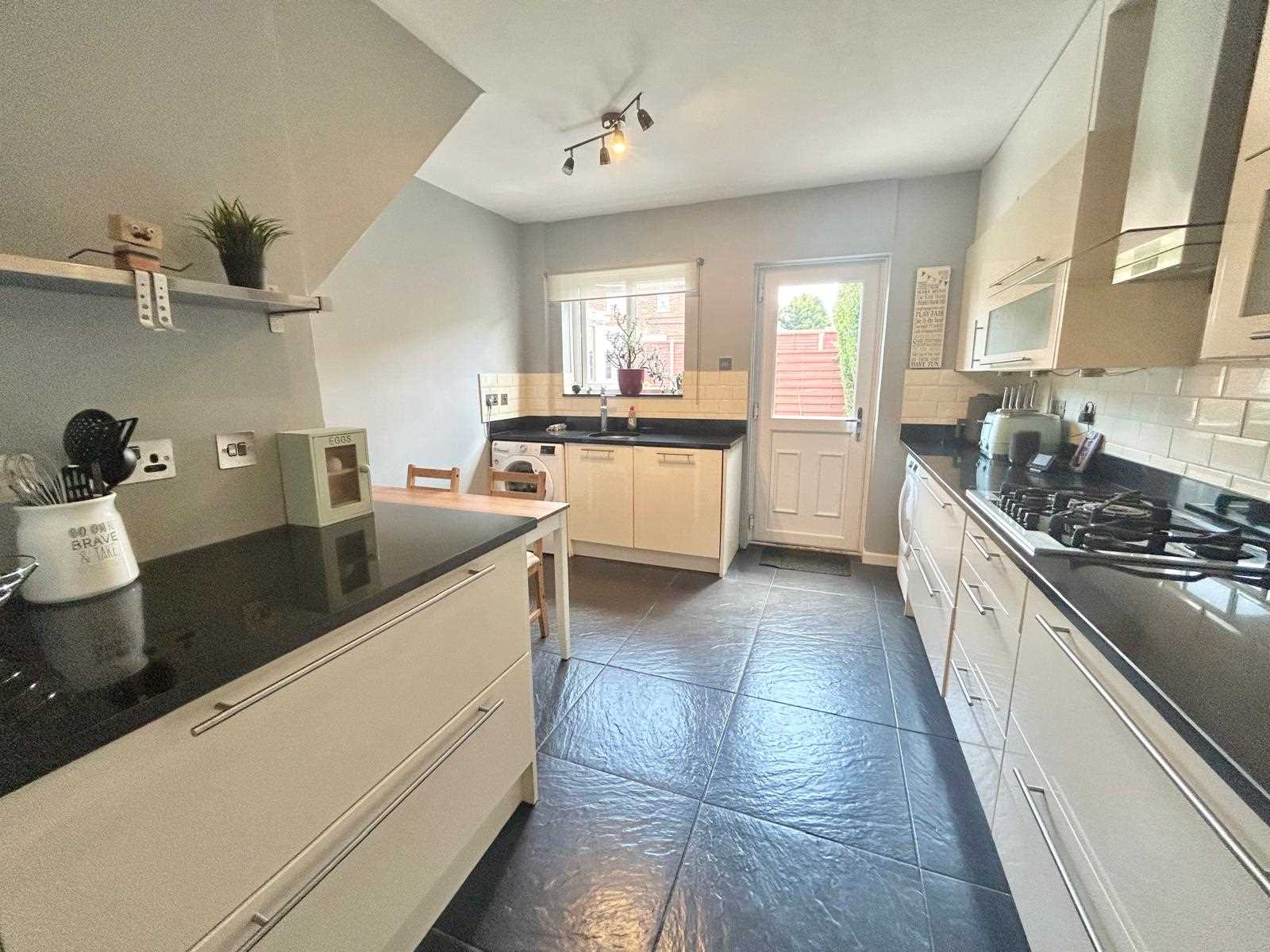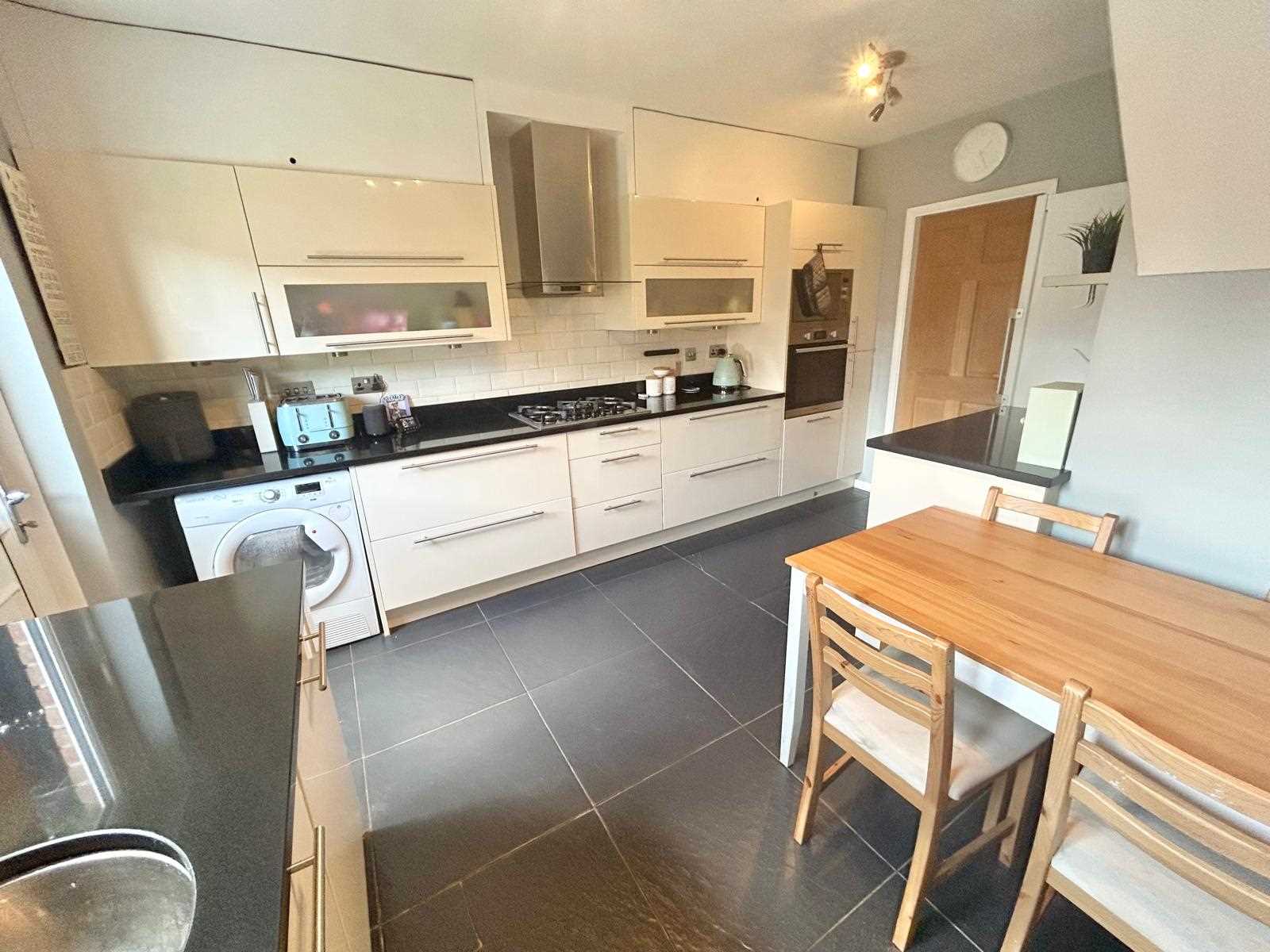Cream gloss fitted base and wall units with black granite work surface over. Integrated Fridge drawers, integrated microwave and oven, five ring gas hob with extractor above, plumbing and space for washing machine and dishwasher, tiled flooring, space for table & chairs, UPVC double glazed window & door to the rear aspect.