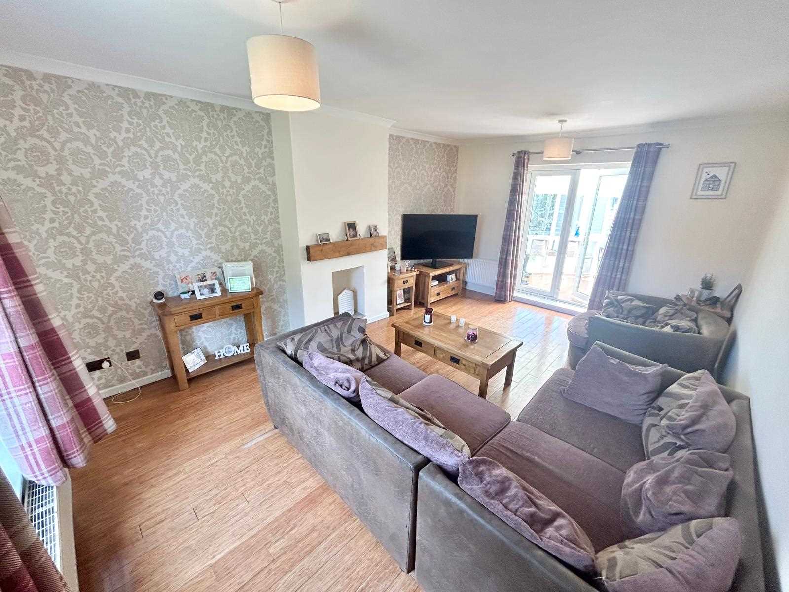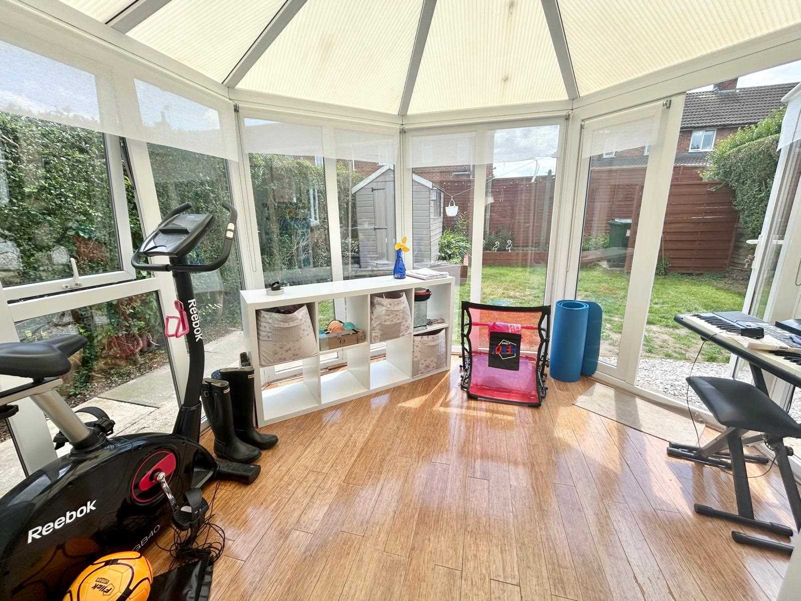 Doors from the living room into conservatory, wood effect floor, doors giving access the rear garden.