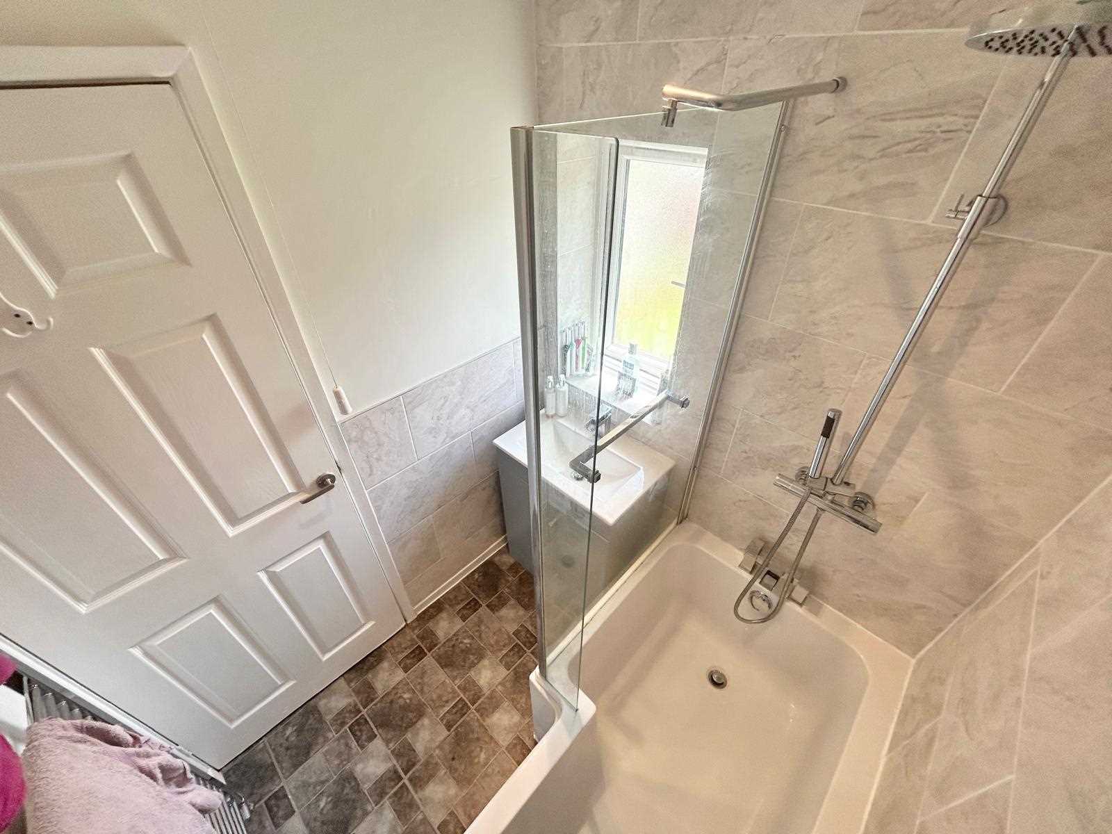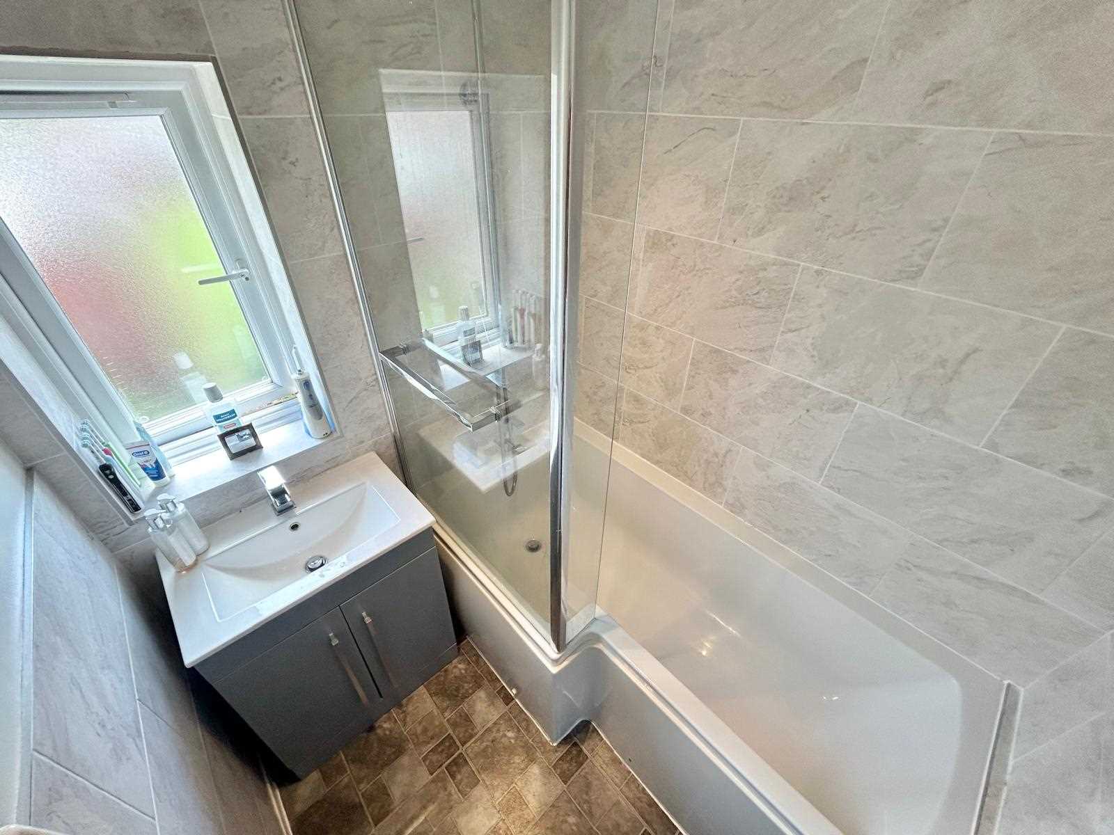 Bathroom includes L shape shower bath with mains shower over, fully tiled walls, wash hand basin with storage unit below. UPVC double glazed window to the rear aspect.